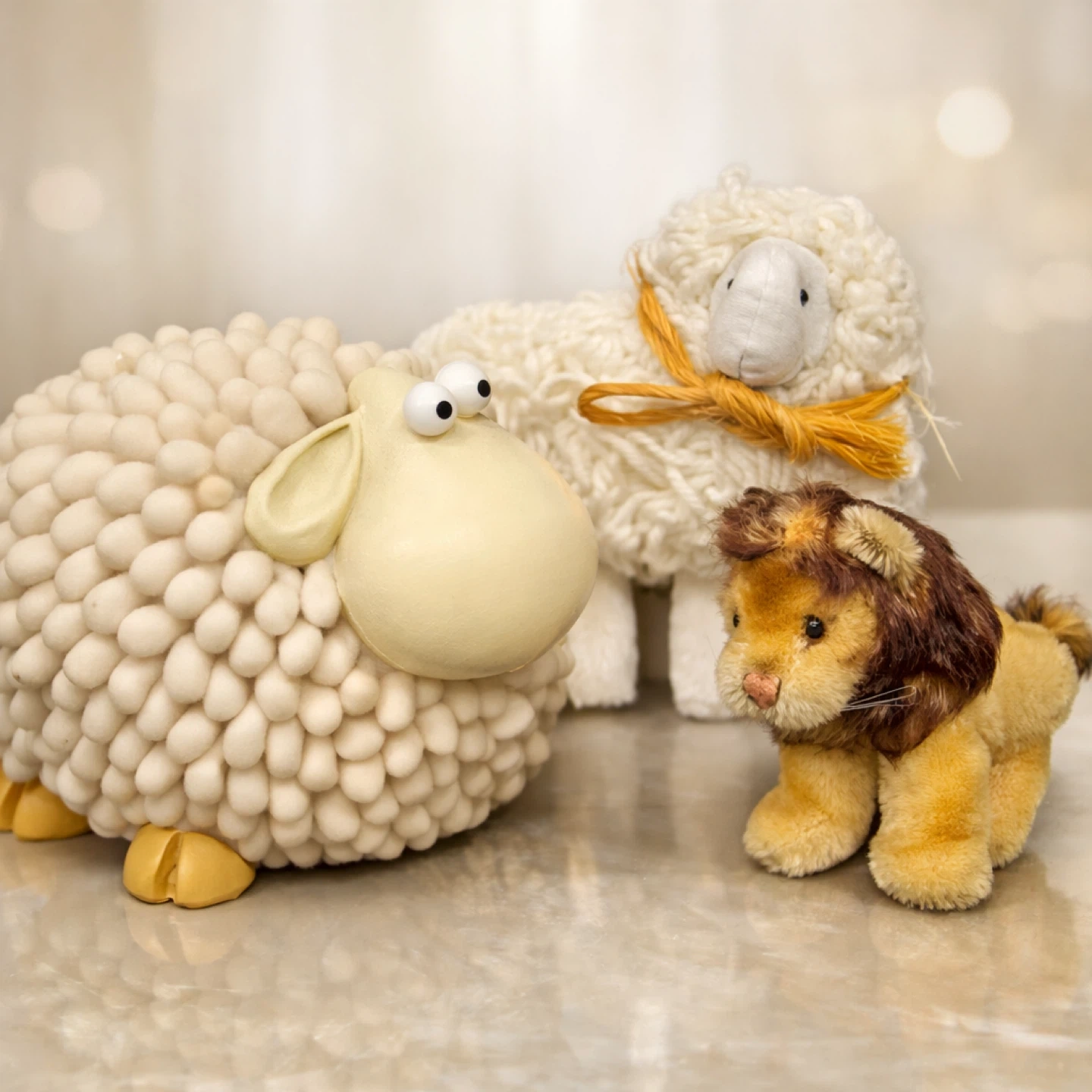 This set features a decorative sheep with a textured body and a small, plush lion figure. The sheep is cream-coloured with yellow accents on its feet. It's a charming decorative piece!