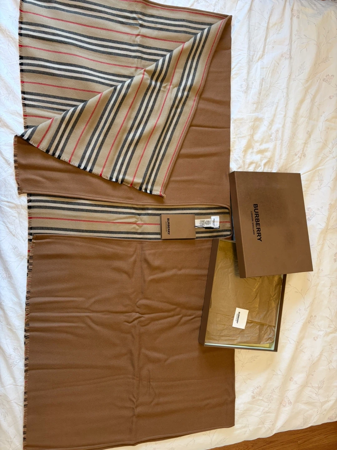 Burberry poncho featuring the iconic check pattern on one side and a camel colour on the other. Comes with the original Burberry box, tissue paper, and tags. Brand new / never used.