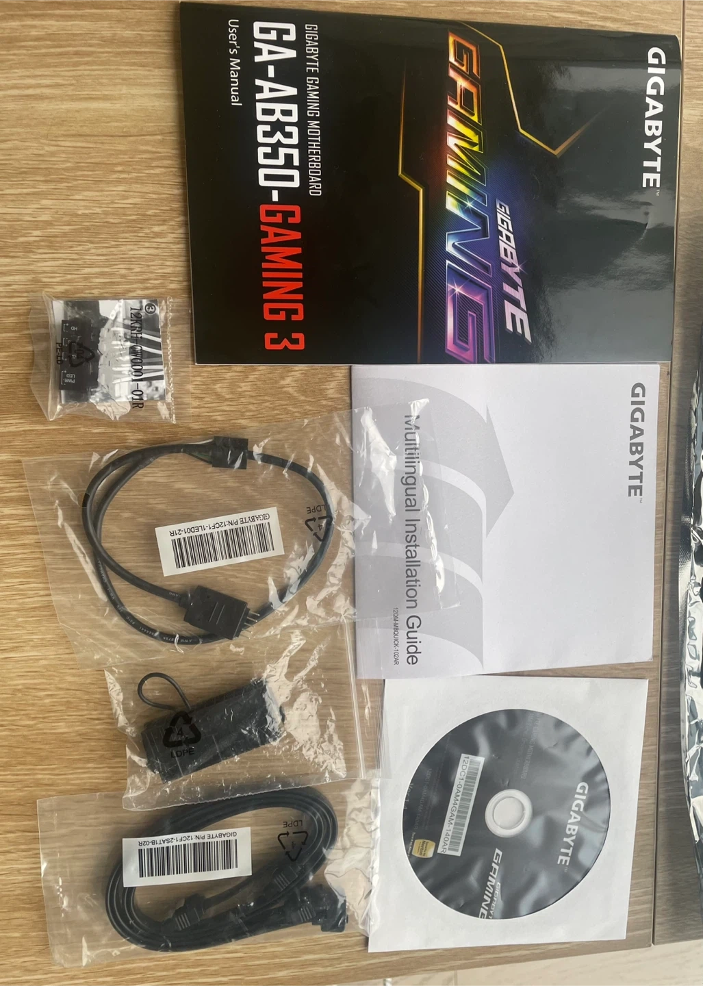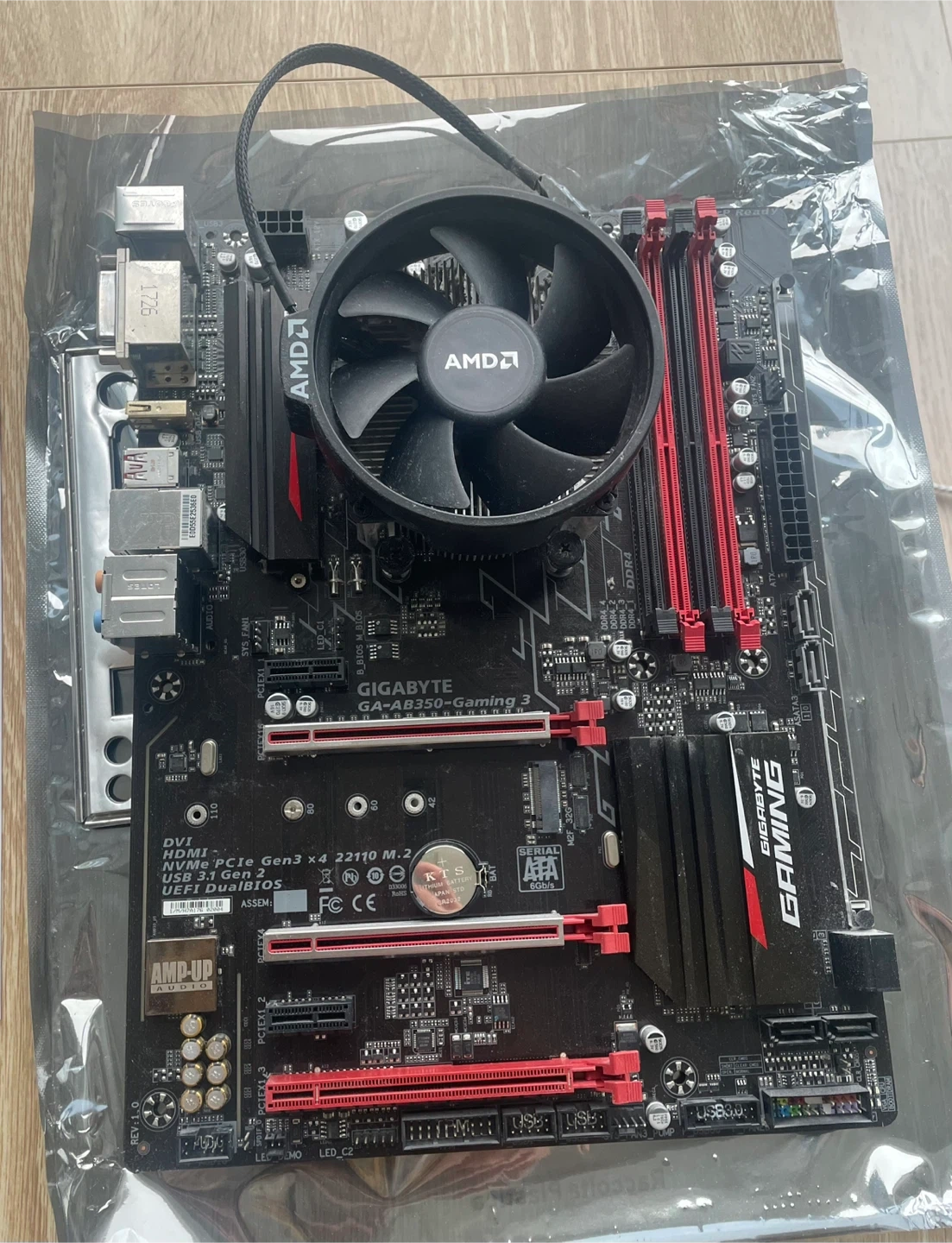 This is a Gigabyte GA-AB350-GAMING 3 motherboard and an AMD Ryzen 5 1600 6 core processor with stock cooler.