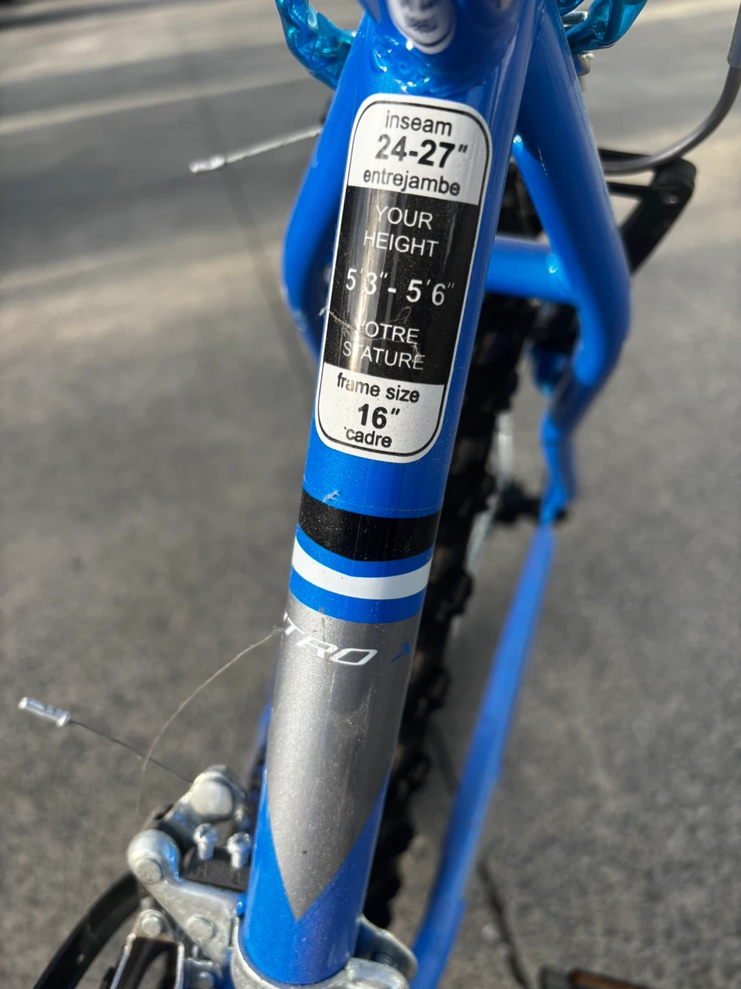 This blue Supercycle Nitro XT mountain bike is a great choice for young riders. It features a 16" frame and is recommended for heights 5'3" to 5'6". The bike is blue and has multiple gears for varied terrain.