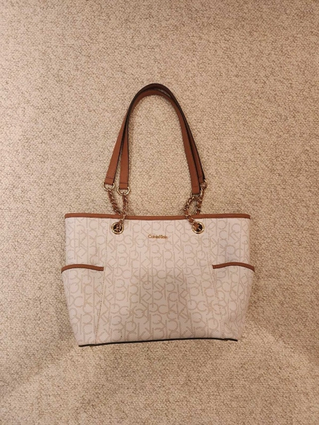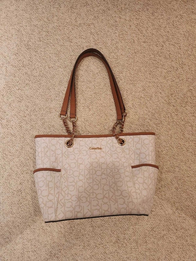 This stylish Calvin Klein tote purse features the iconic CK logo pattern, complemented by brown accents on the handles and trim. It's in used, like new condition.