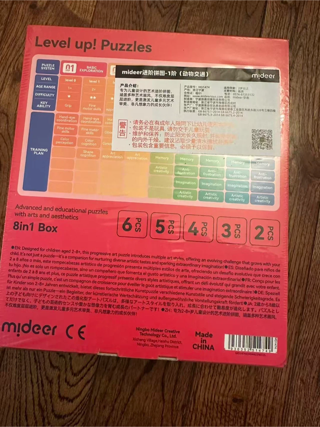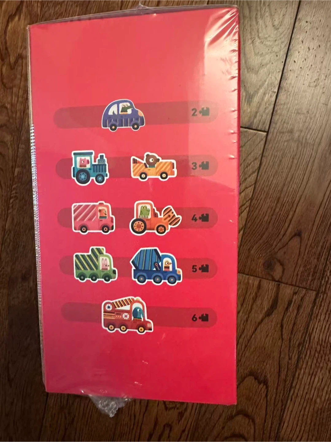 This Mideer Level Up! Puzzles set comes with 8 different puzzles featuring vehicles. It's designed for ages 2 and up. Each puzzle aids in developing artistic creativity and fine motor skills.