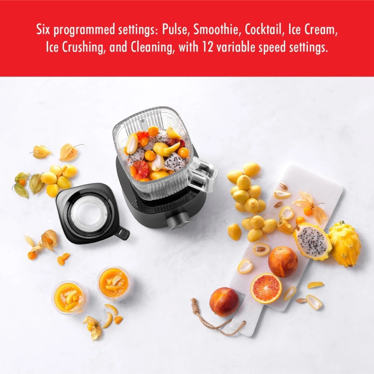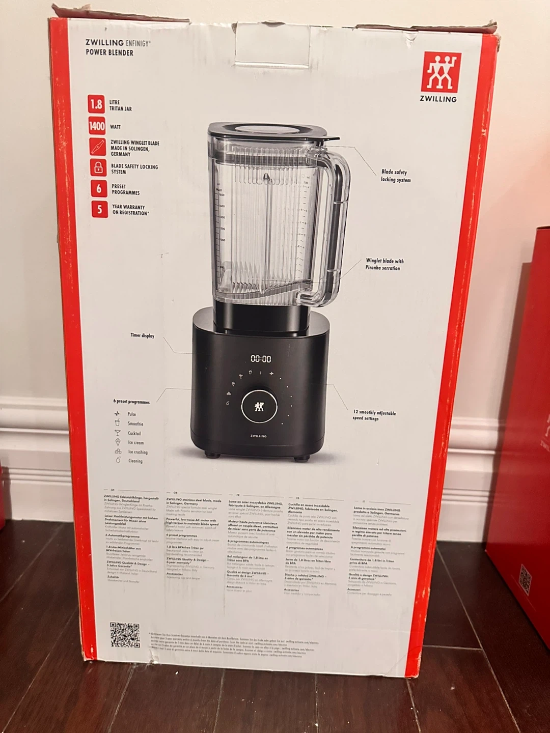 This Zwilling ENFINIGY Power Blender is black. It has 6 preset programmes and 12 adjustable speed settings. It's perfect for smoothies, cocktails, and ice crushing!