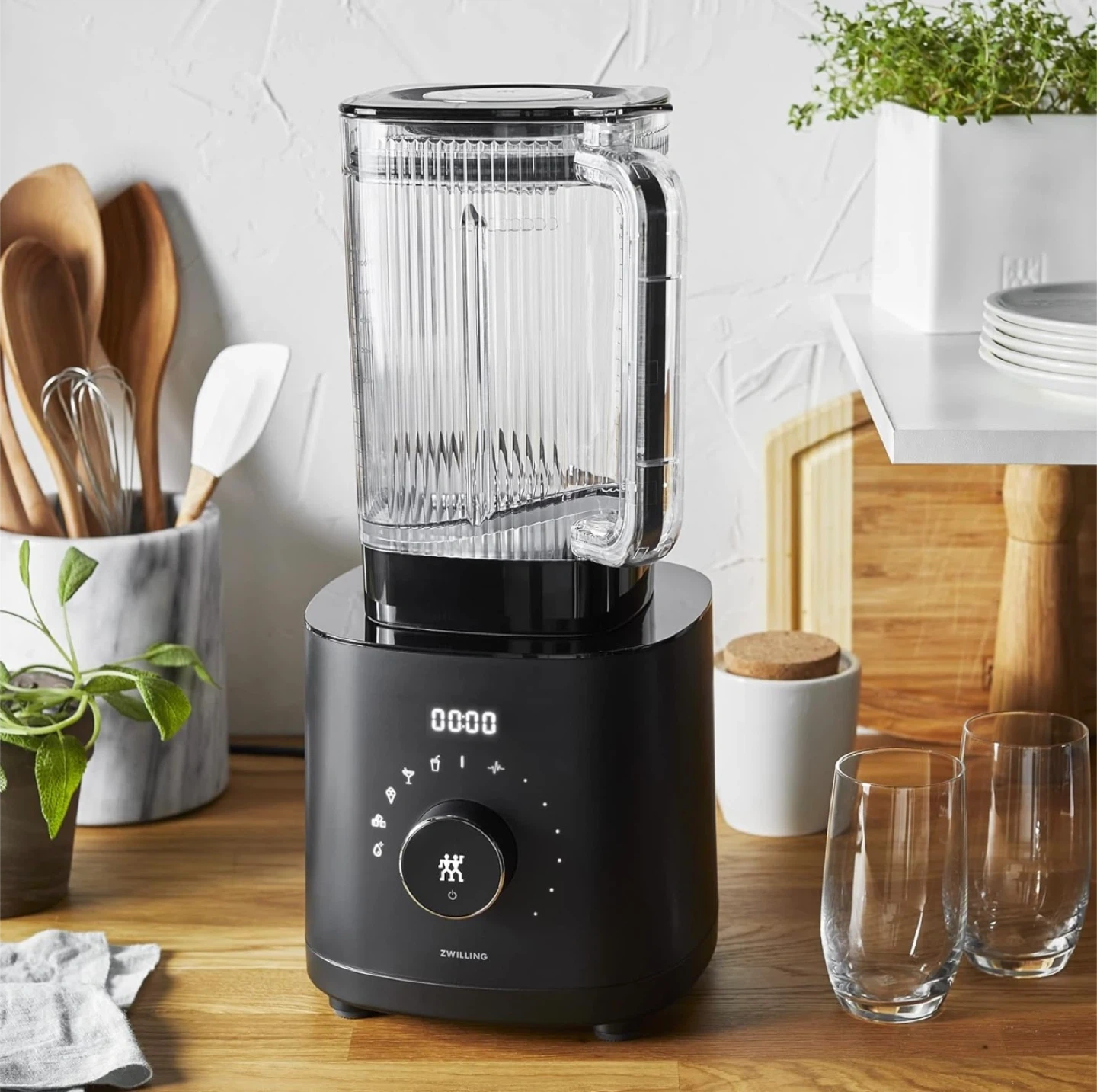 This Zwilling ENFINIGY Power Blender is black. It has 6 preset programmes and 12 adjustable speed settings. It's perfect for smoothies, cocktails, and ice crushing!
