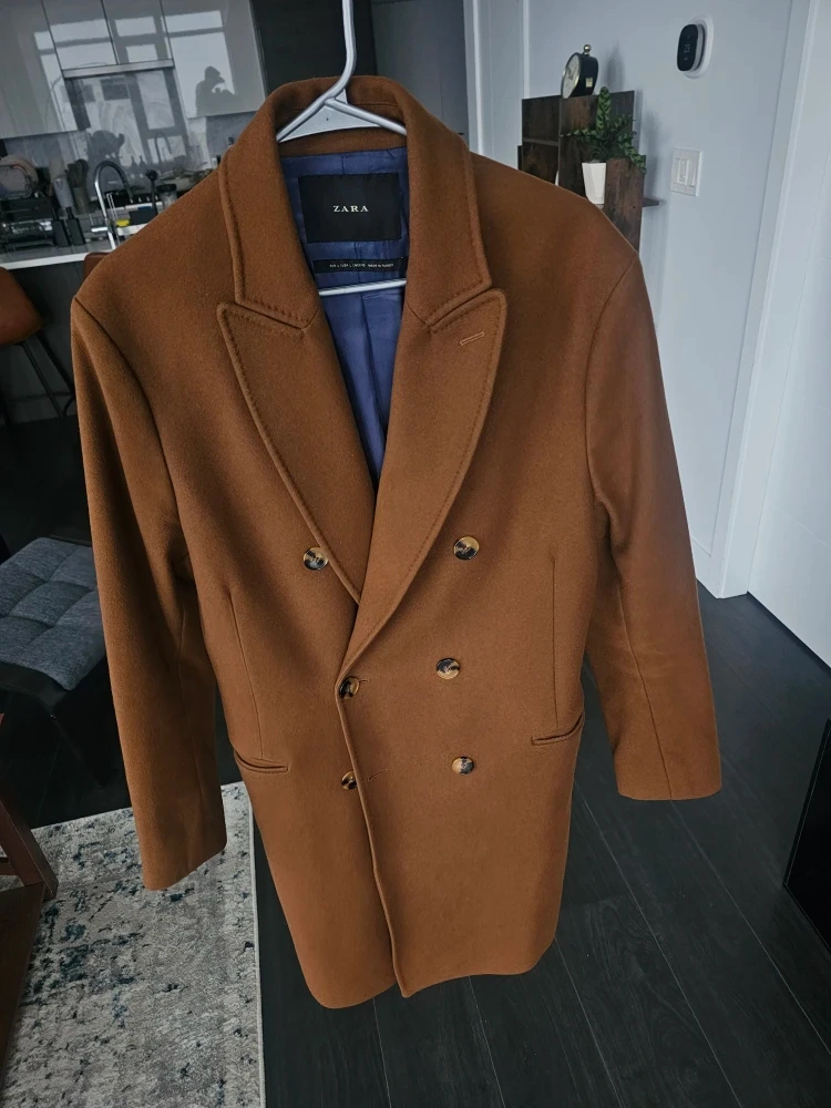A stylish ZARA men's double-breasted coat in a rich brown colour. It's made from a wool blend and features a classic lapel design. This coat is size L but fits like an M. Made in Turkey. Pick up Metrotown. Coat is in perfect condition