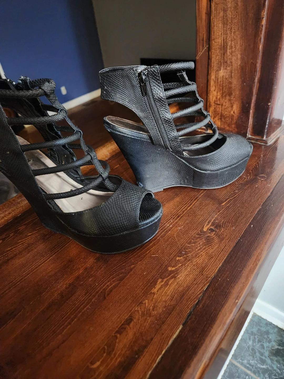Buy & SellBlack Peep-Toe Wedge HeelsBlack Peep-Toe Wedge Heels$59Stylish black wedge heels with a peep-toe and strappy design. Features a side zipper for easy wear. Material appears to be faux snakeskin.WHERE TO MEETDowntown rideauView MapSELLER514987Downtown100 reviews0 chats·0 favorites·6 viewsSEND CHAT TO SELLERHi 514987! I’m interested in your listing.Hi 514987! I’m interested in your listing.Get the Karrot app to chatSign In to chat