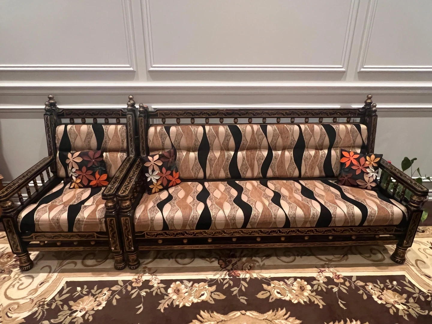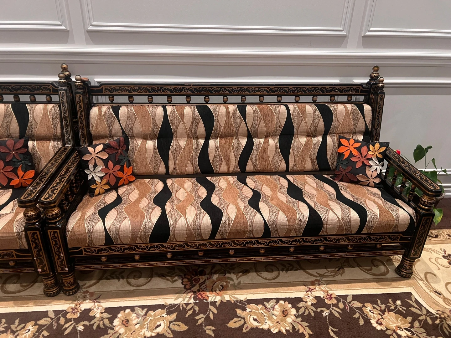 Vintage Black and Gold Wood Sofa Set with Coffee Table