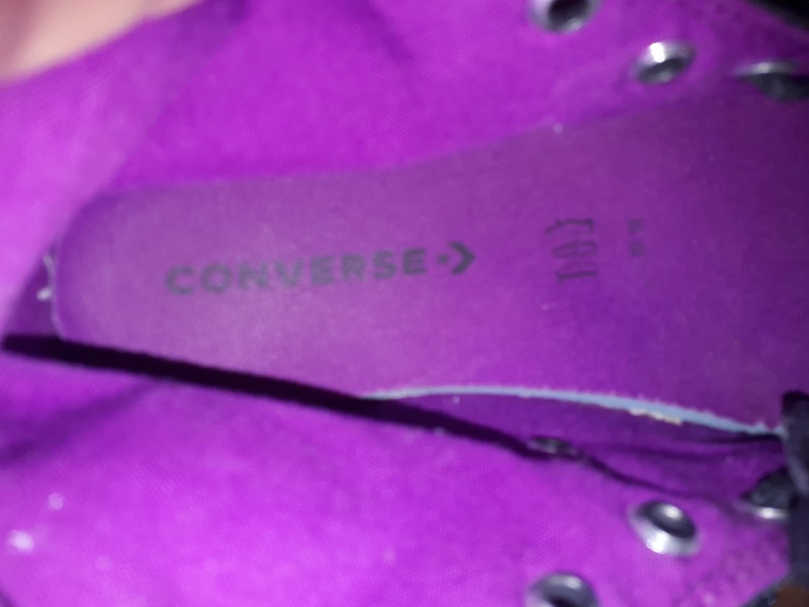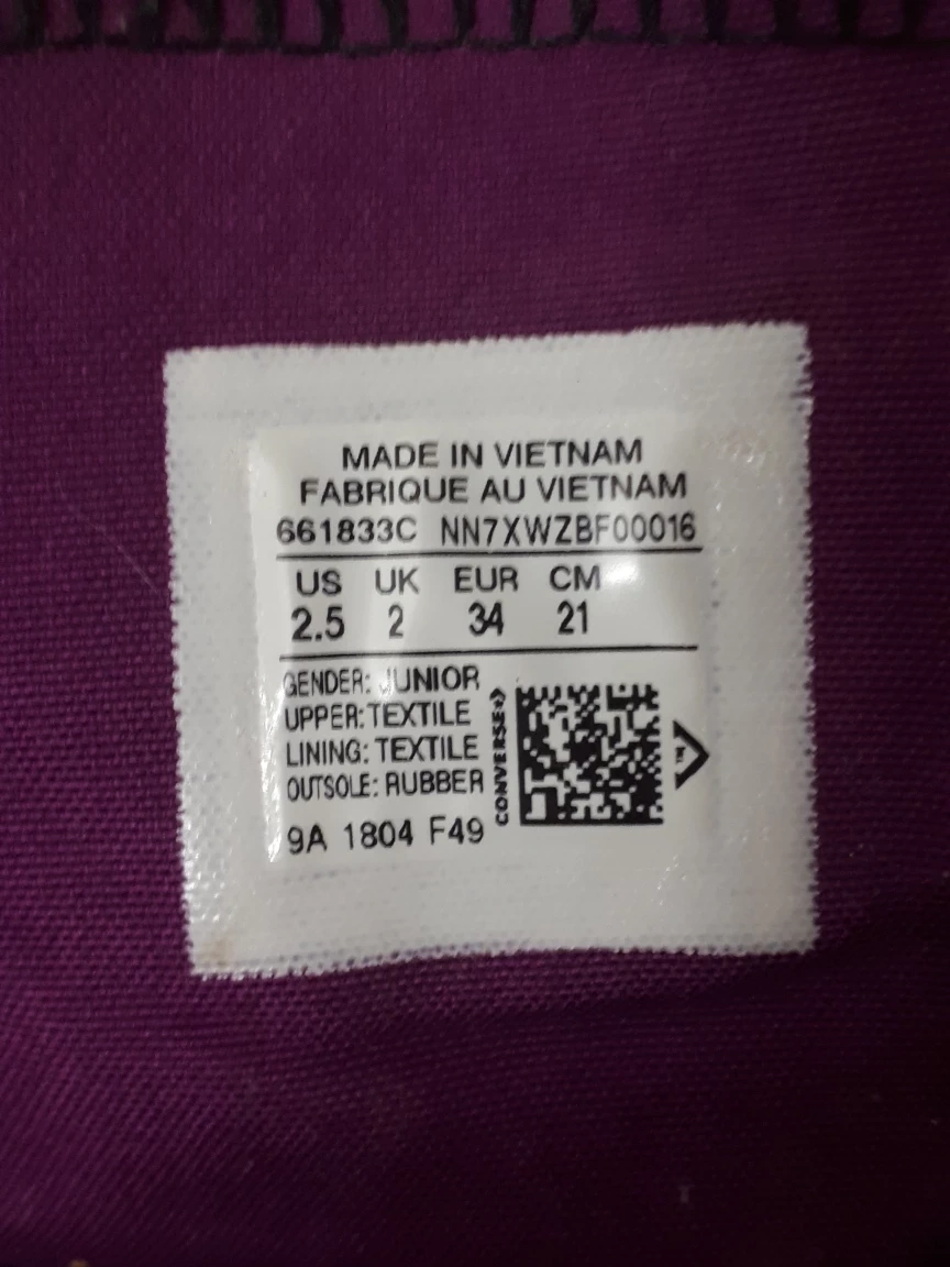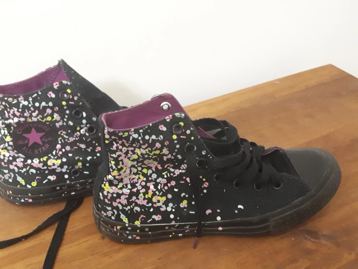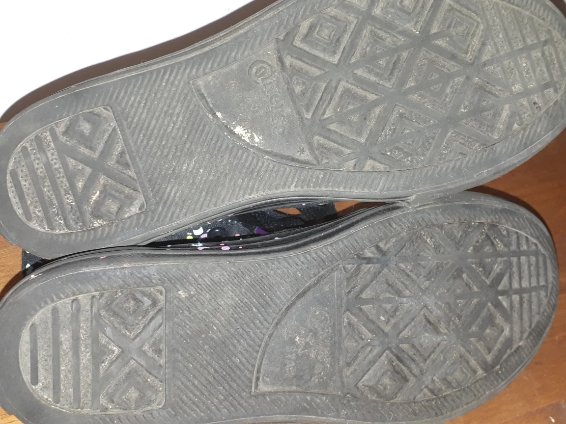 Converse All Star high top sneakers for juniors. Size 2.5. Worn once. Got upset with tying the shoelaces and never reached for them again... 😕 Black with a colourful floral print. Textile upper and lining, with a rubber outsole. Includes original laces.