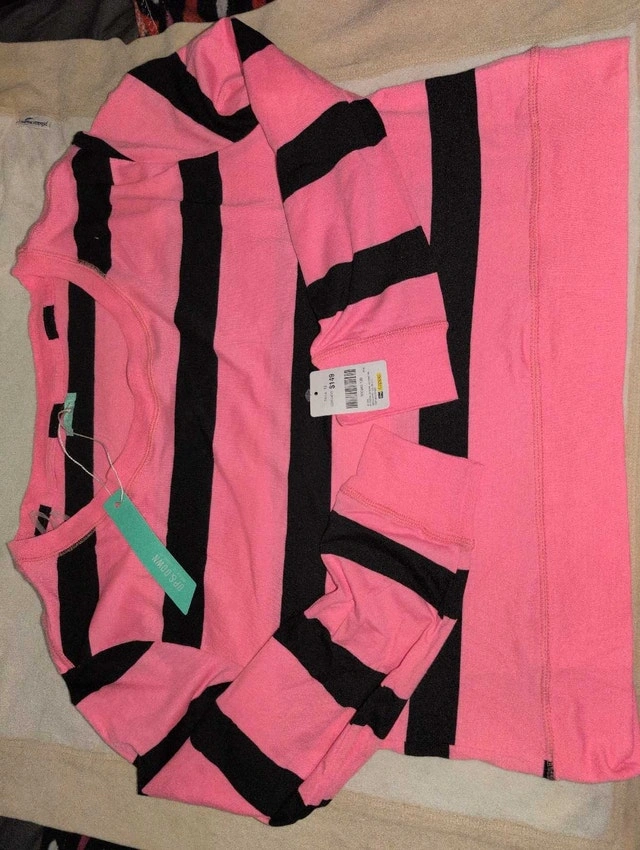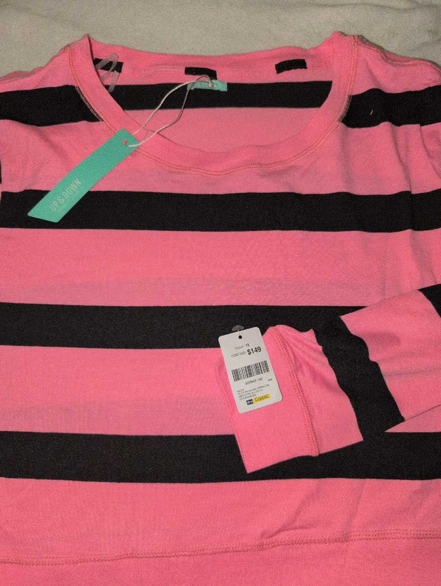This is a brand new, never worn Up & Down sweater. The sweater is pink with black stripes and is still in its original packaging with tags. Perfect for adding a pop of colour to your wardrobe! Brand: Up & Down. Colour: Pink and Black. Condition: New with tags. If the ad is still up, the sweater is still available!