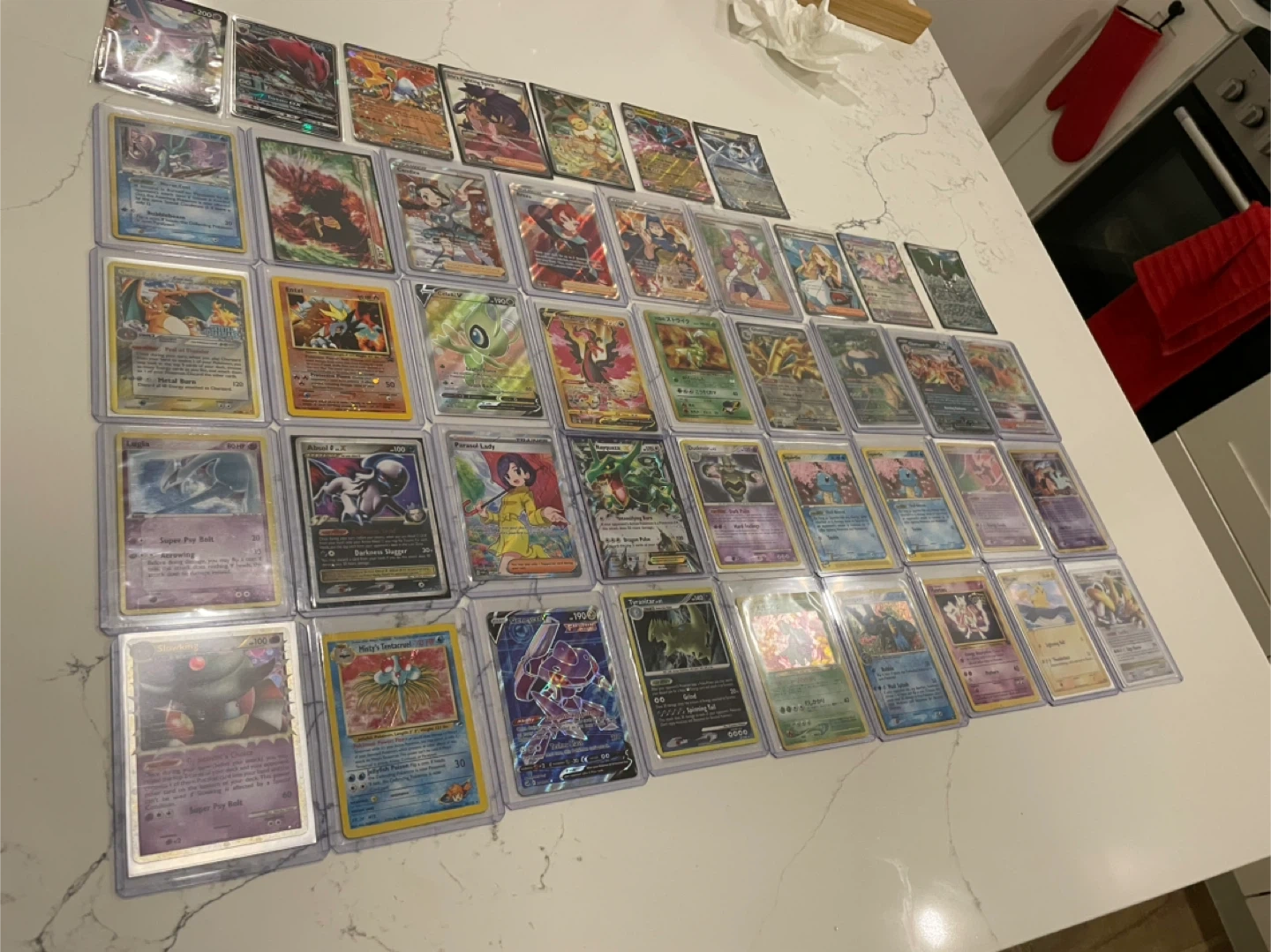 A diverse collection of Pokémon trading cards. These cards feature various characters and artwork from the Pokémon universe. They're housed in protective sleeves for safekeeping. This is a great assortment for collectors or players!