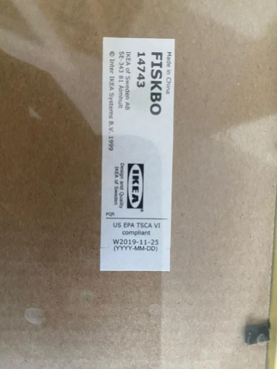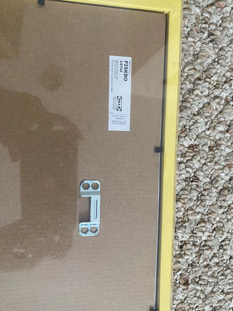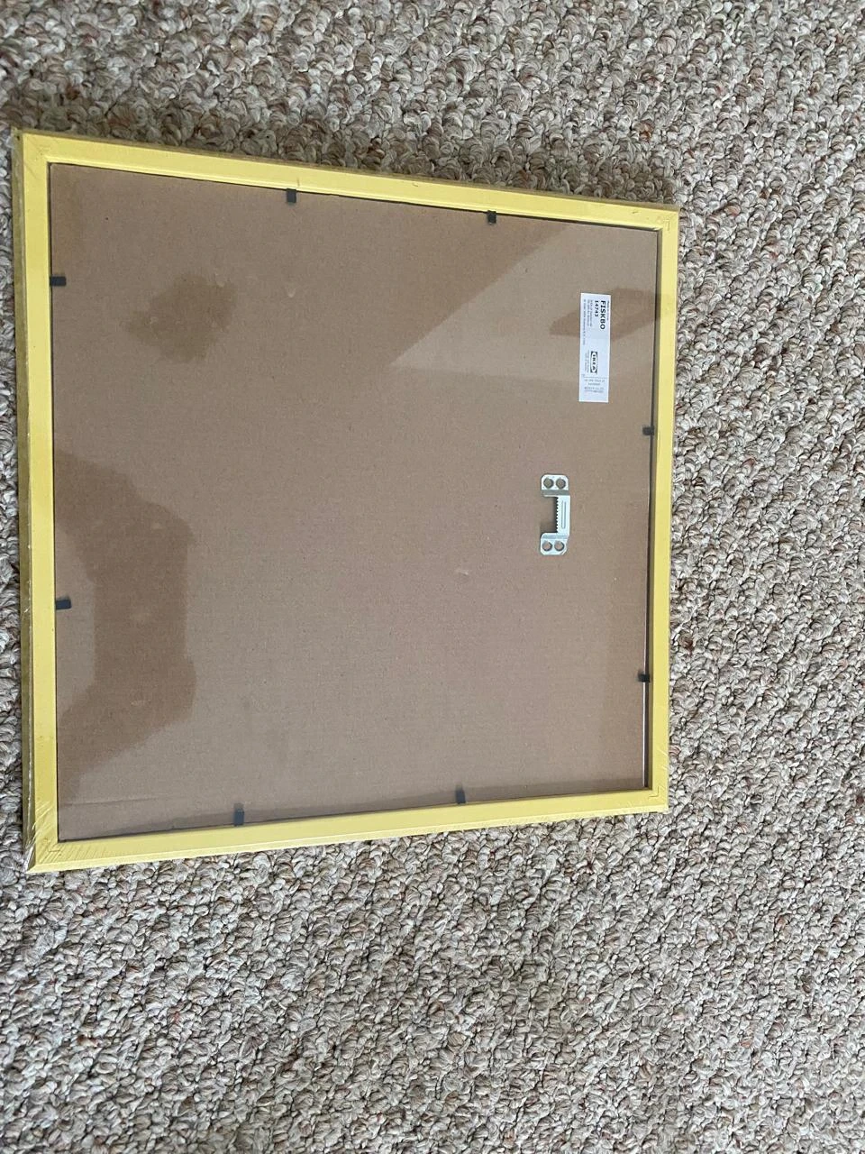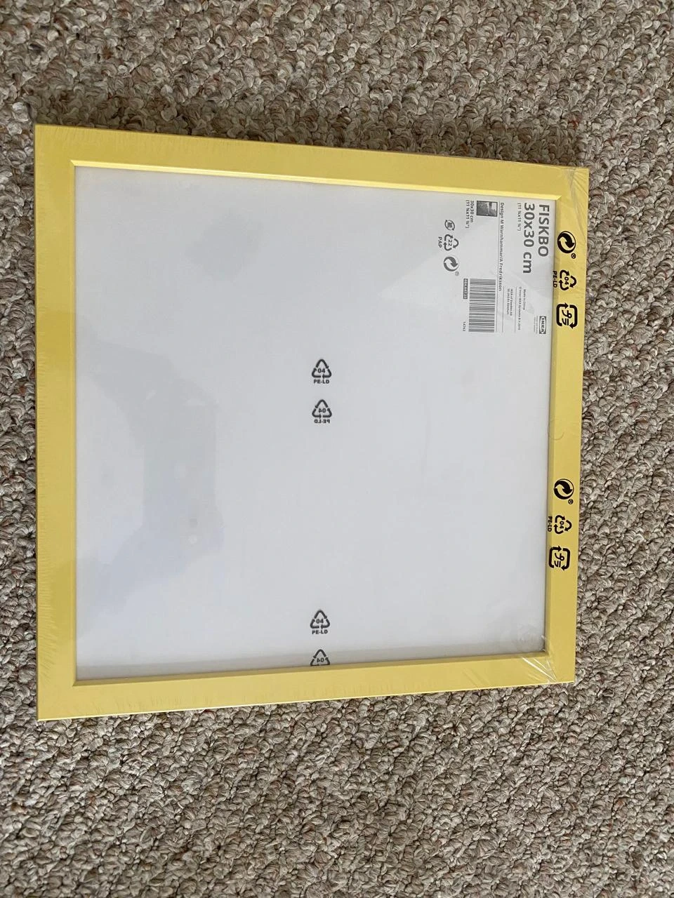This is an IKEA FISKBO picture frame. It's yellow and measures 30x30 cm. The frame is made of particleboard and foil.