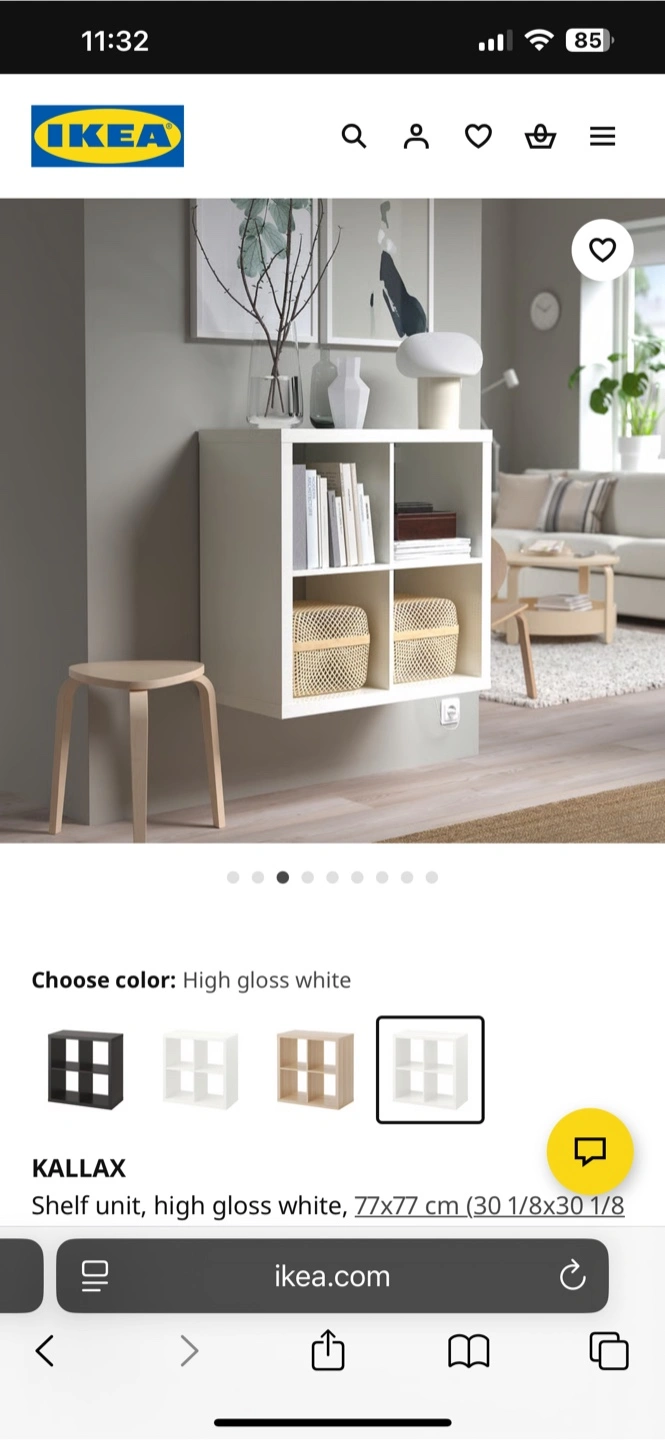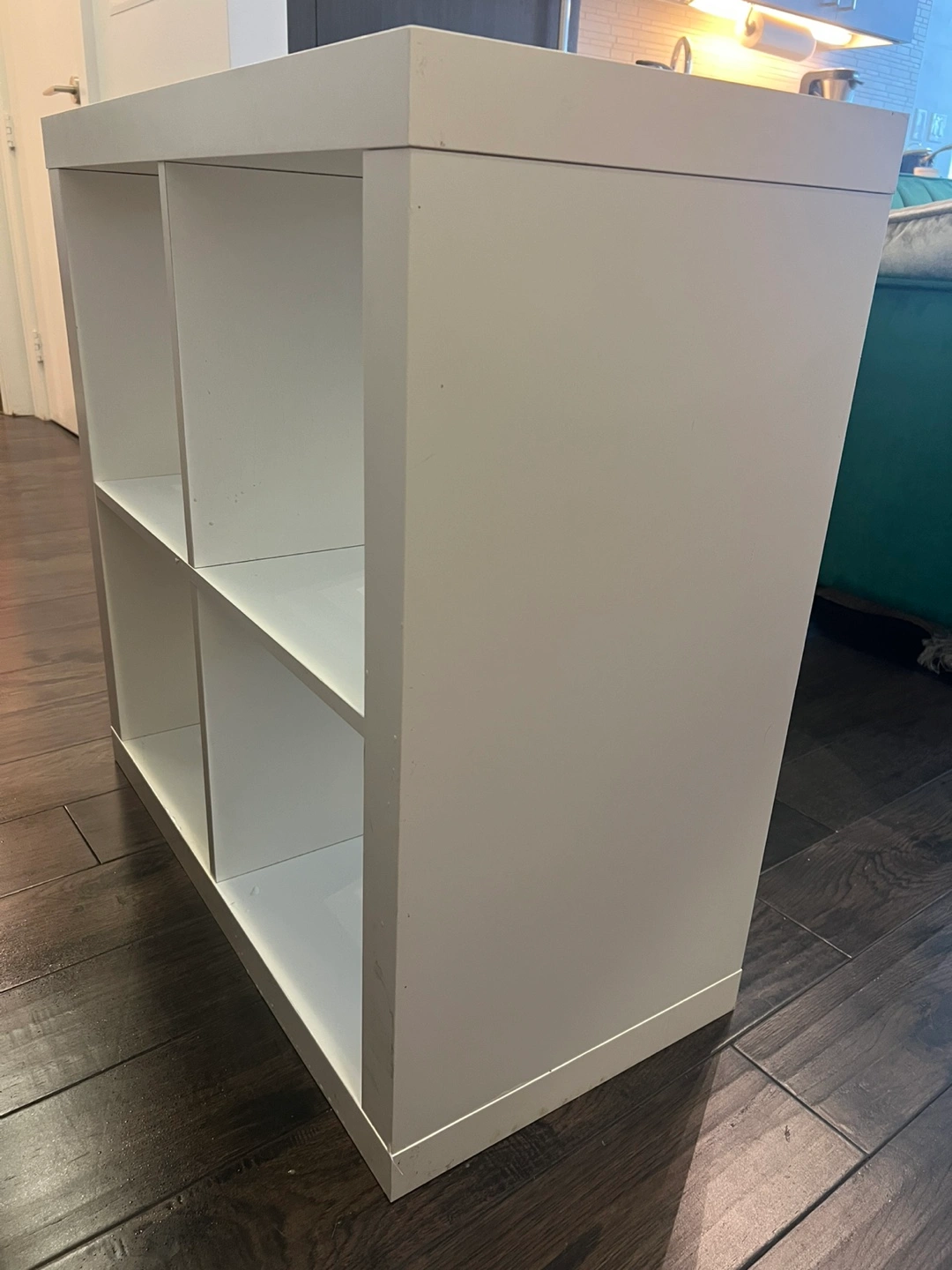 Selling an IKEA Kallax shelf unit in white. It's ready to organize your space! The unit has a 4-cube design, perfect for storing books, decor, or anything else you need to keep tidy. Dimensions are 77x77 cm (30 1/8x30 1/8 ")