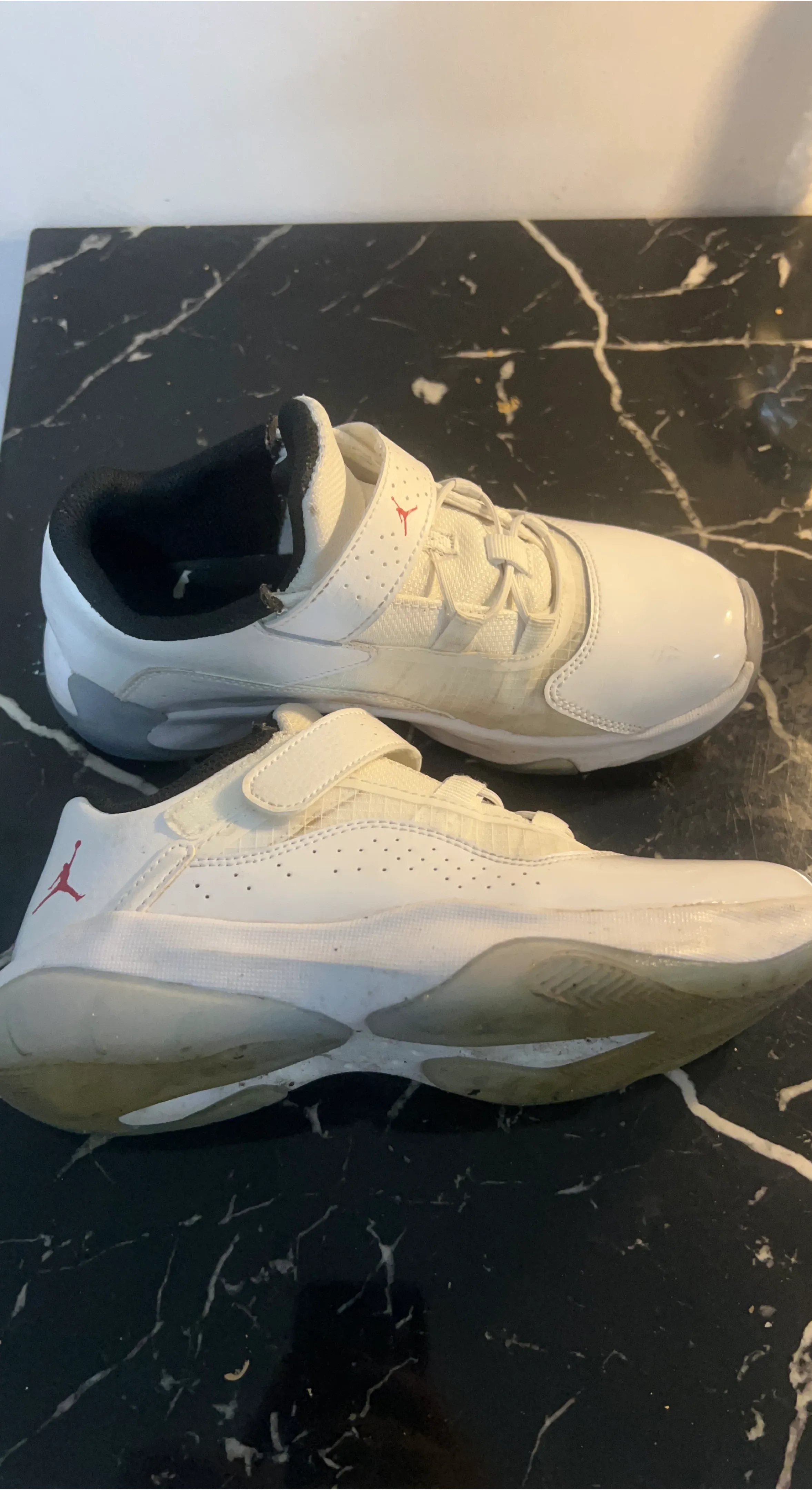 White Jordan sneakers with velcro straps. The shoes are white with red Jumpman logos on the side and strap. They've got a sleek, classic look. Size 3 Y