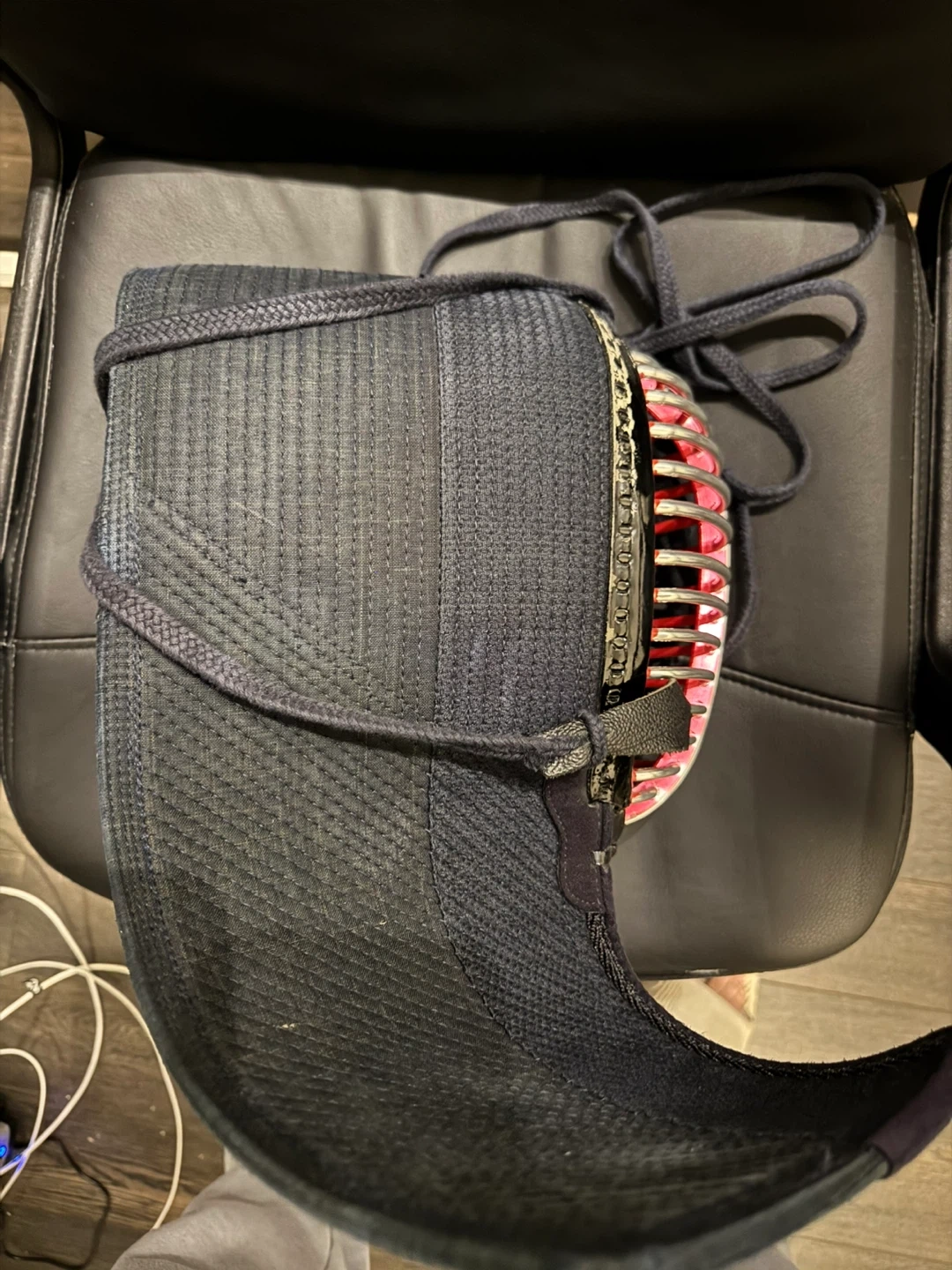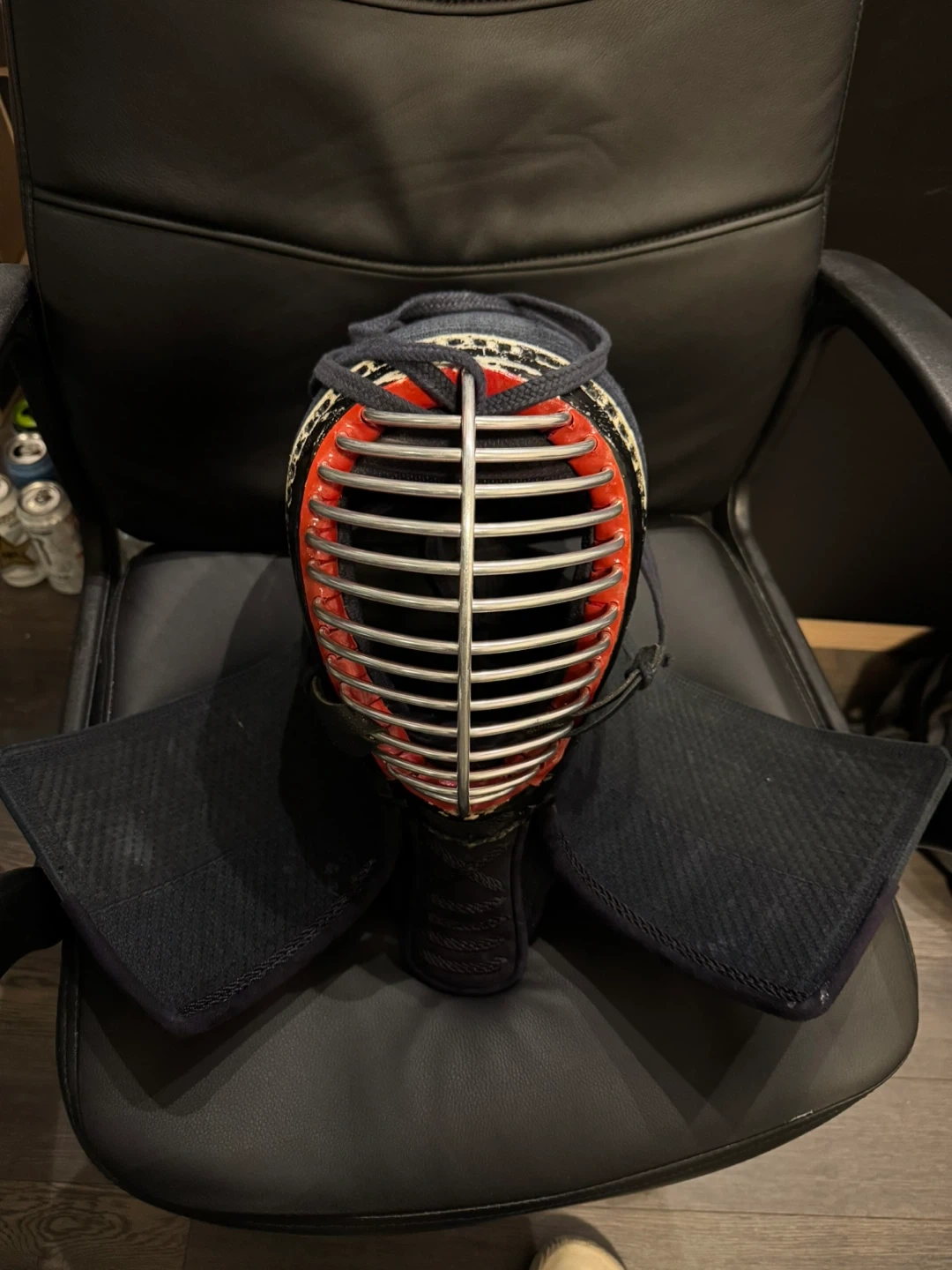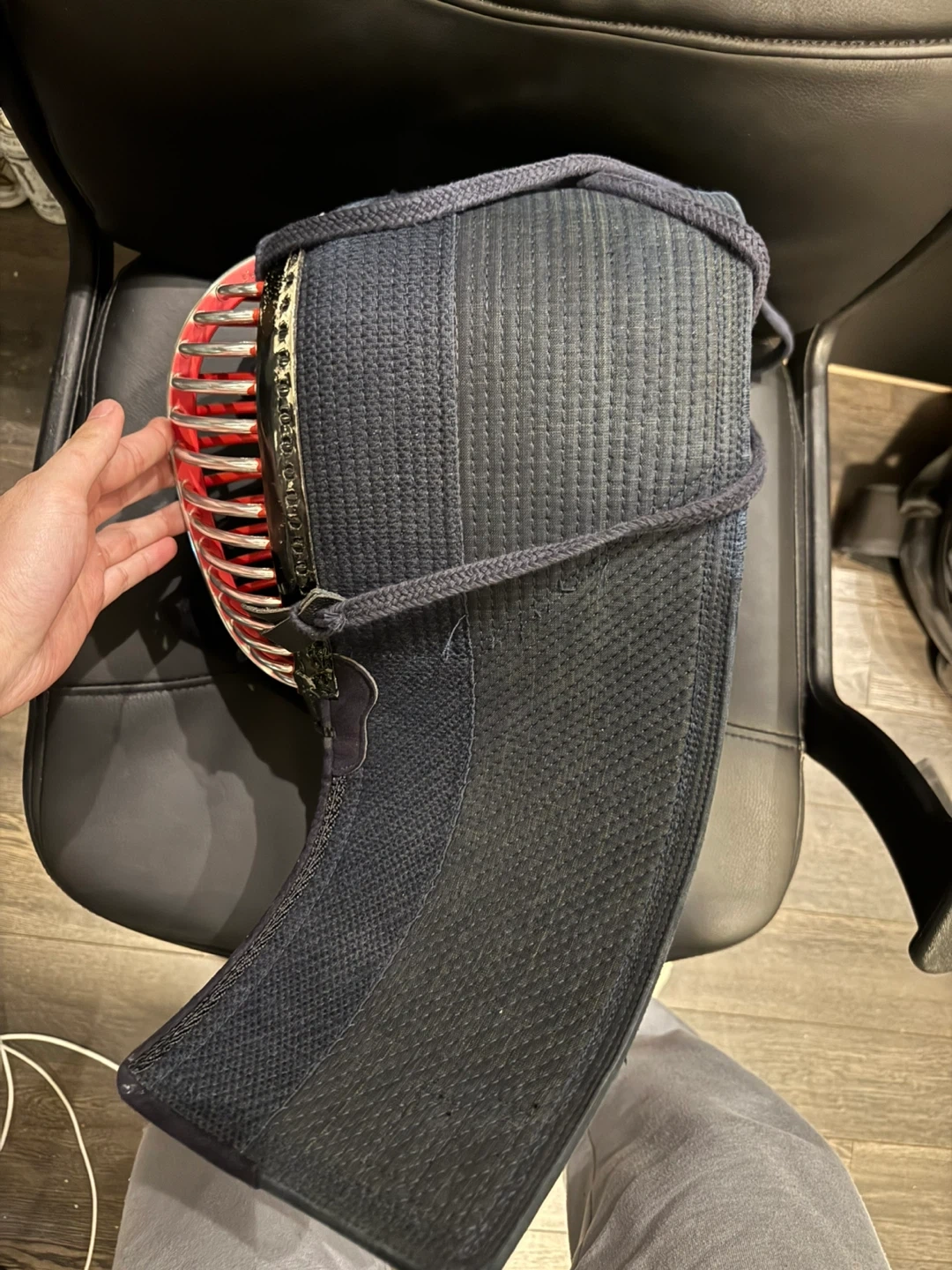 This is a Kendo Men, designed for protective headgear in martial arts practice. It features a metal grill and padded interior for safety. The dark blue fabric exterior is durable for training.
