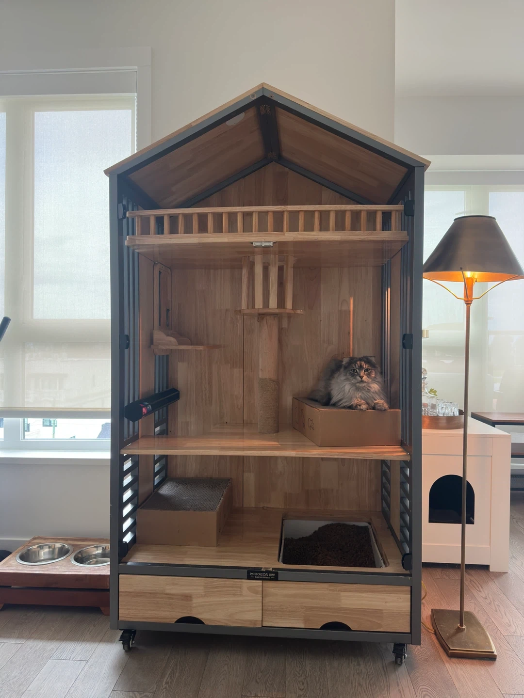 Spacious multi-level cat condo made from wood and metal. It's designed with different platforms, perches, a scratching post, and includes a built-in litter box. This structure is great for cats to climb, play, and rest. Request more more pictures.