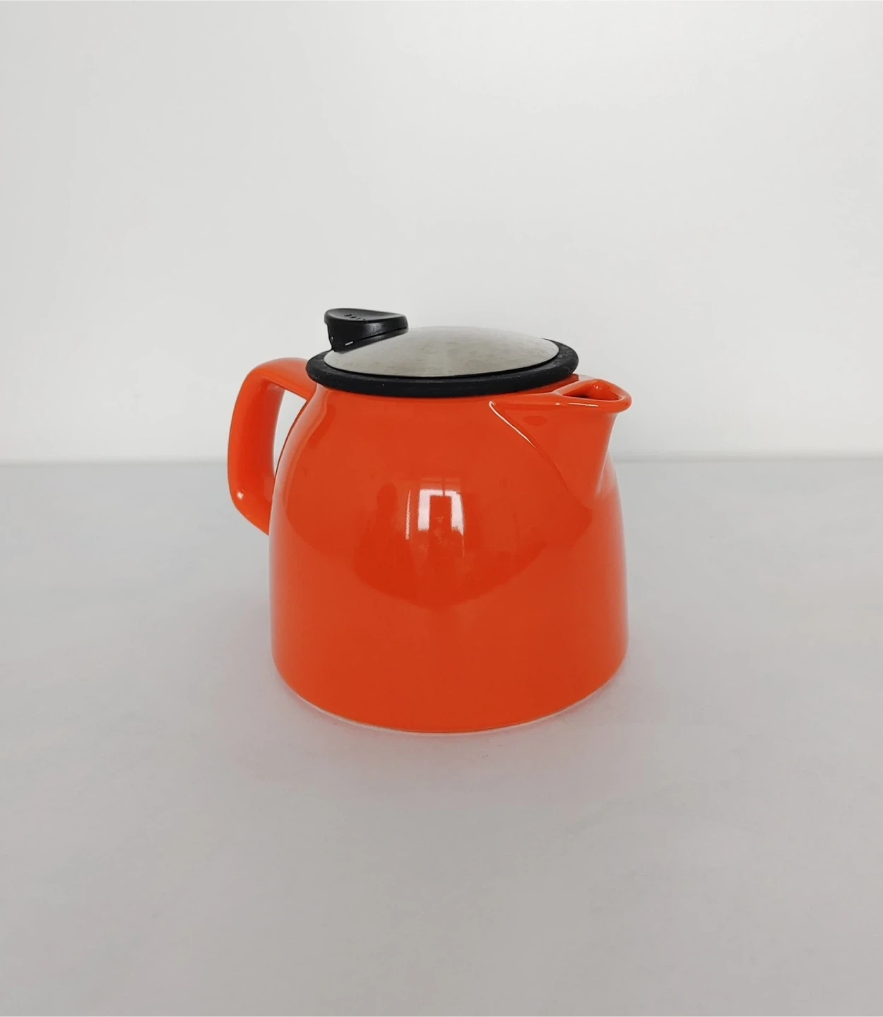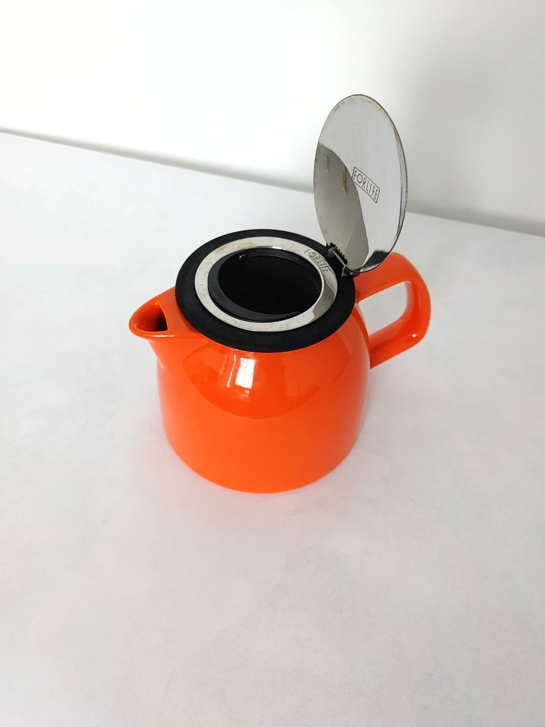 Bright orange ceramic tea pot from Forlife. It includes a removable stainless steel infuser for loose leaf tea. The lid has a brushed metal finish and a black silicone seal. Perfect for brewing your favourite teas.