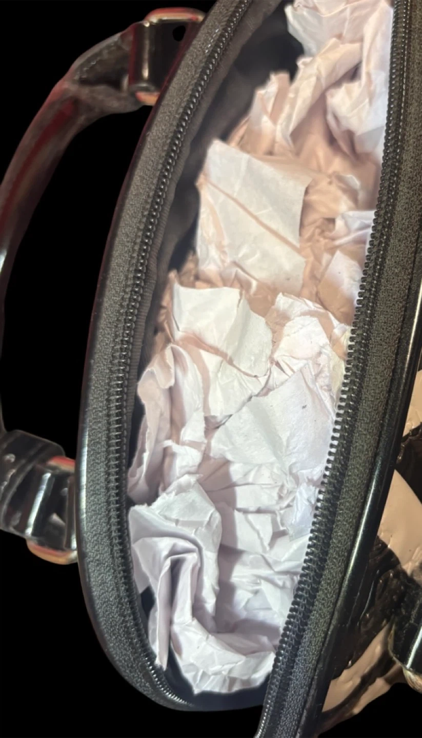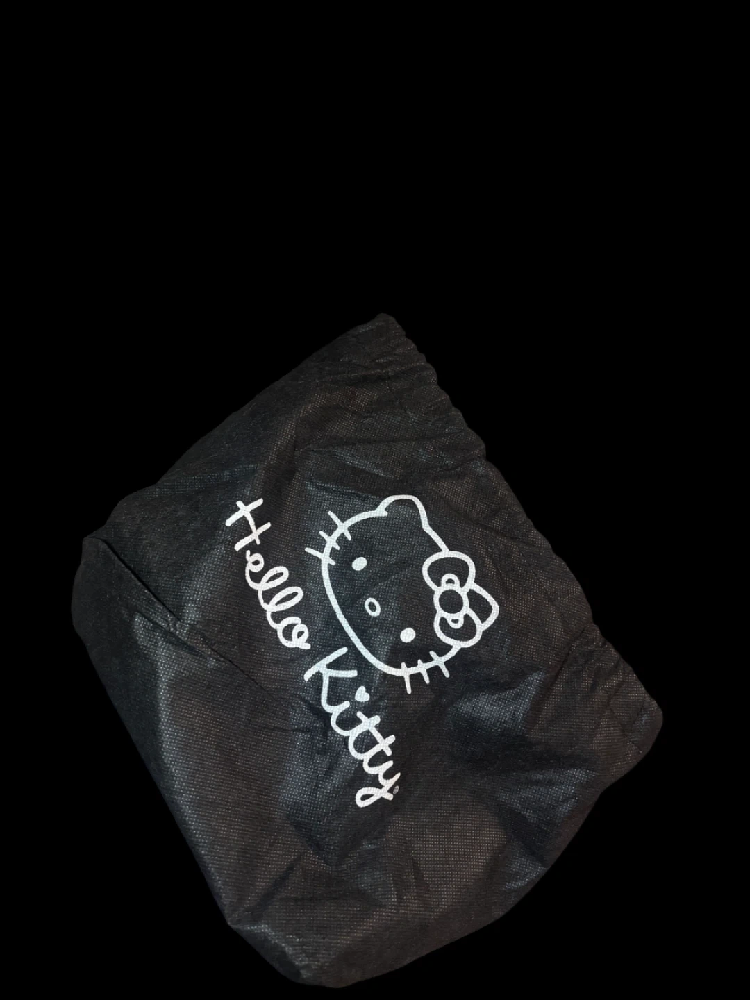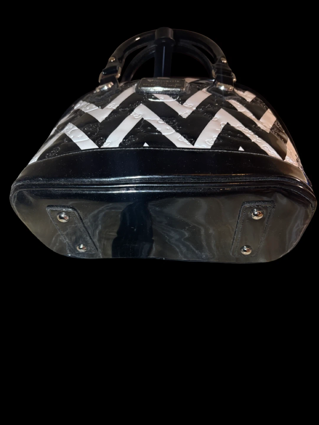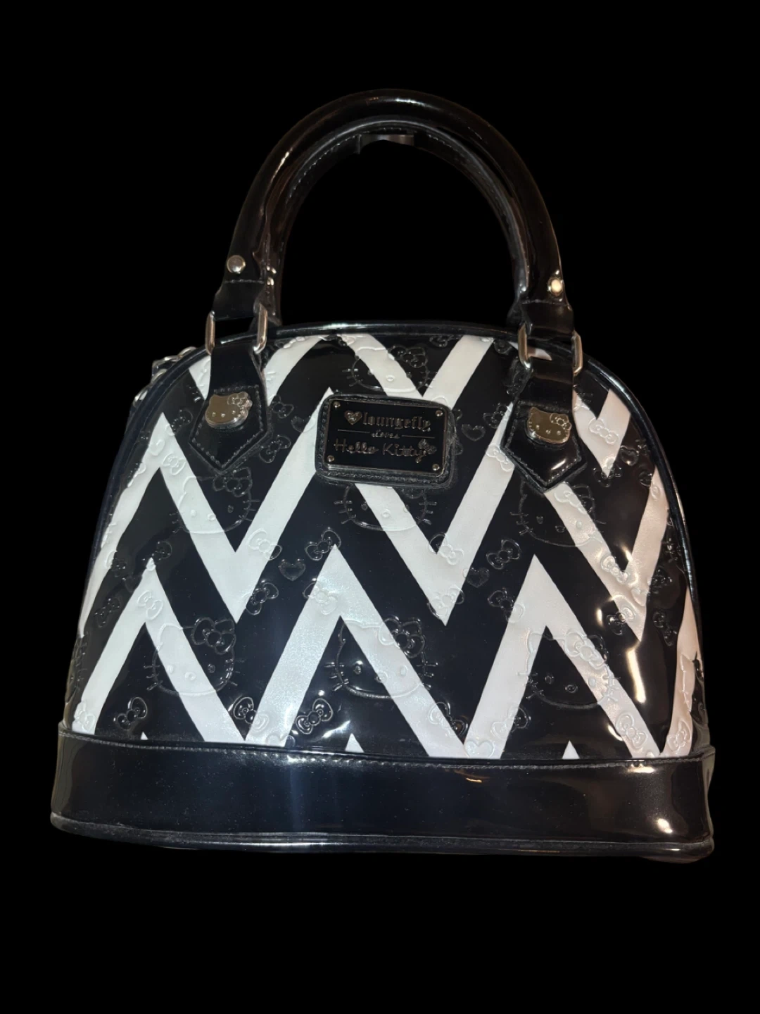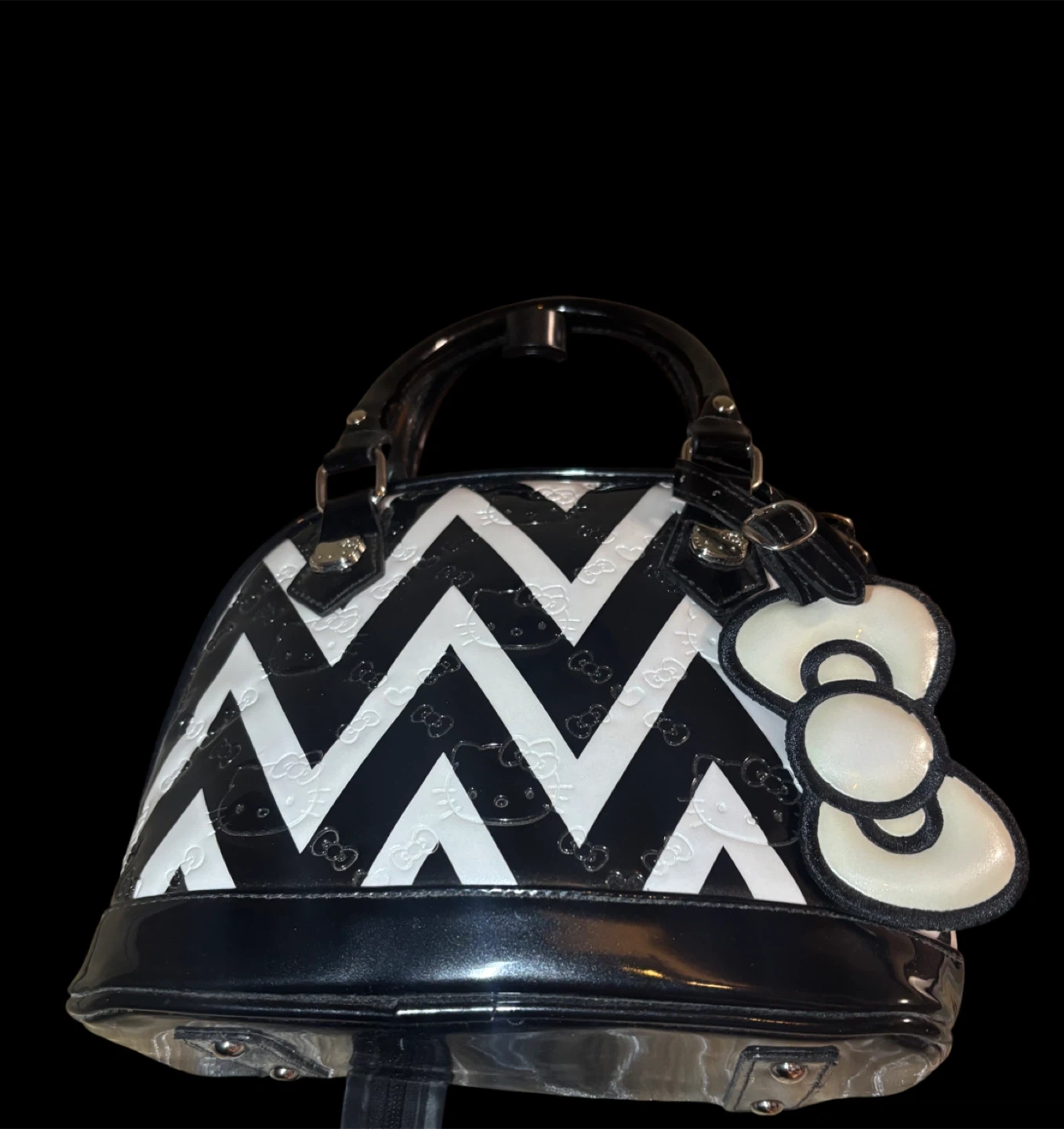 This rate Hello Kitty handbag features a black and white chevron pattern with embossed Hello Kitty faces. It has patent trim and handles, along with a decorative bow charm. A protective dust bag is included.
