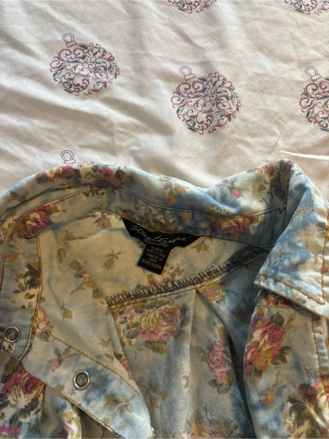 Cute floral button-up shirt from Stitches! It's a size small and features a light blue wash with a colourful floral pattern. Perfect for adding a touch of spring to your wardrobe
