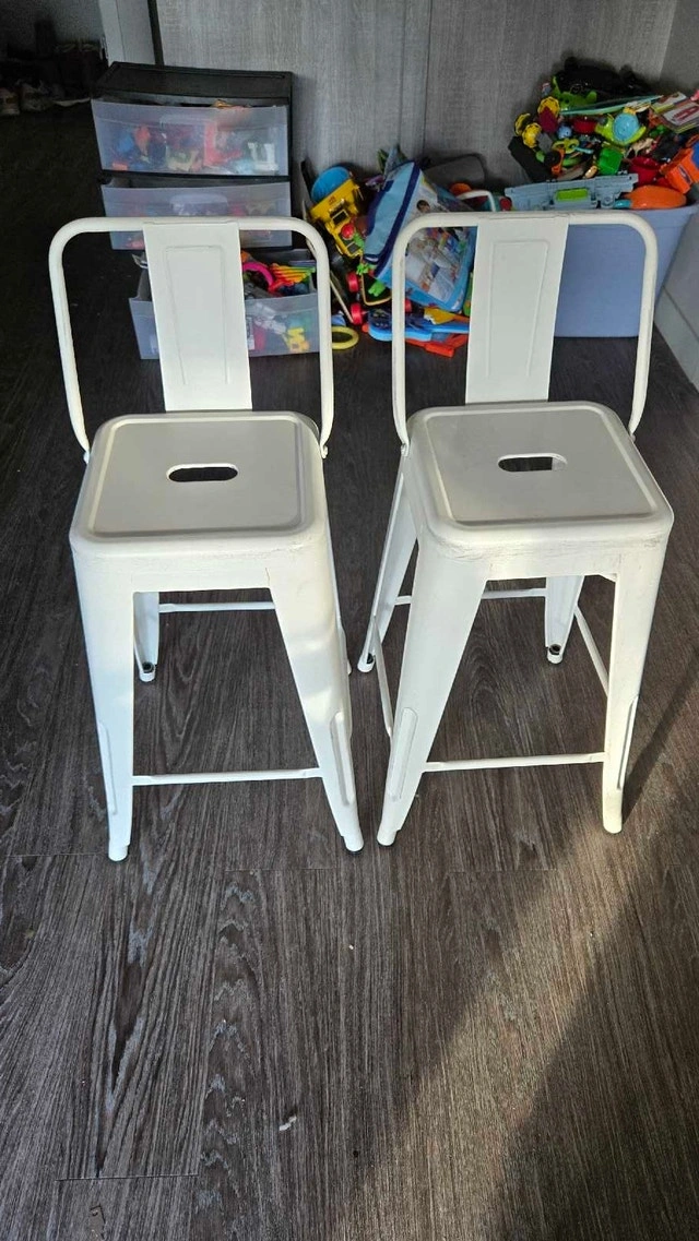 These stylish white metal bar stools are perfect for adding a modern touch to your kitchen or bar area. They are in used condition, showing some signs of wear but are still sturdy and functional. Looking to add a bit of whimsy to your home decor? These stools are the perfect perch for sipping your morning coffee or enjoying an evening cocktail. And remember, if the ad is up, they're still available! Cash accepted.