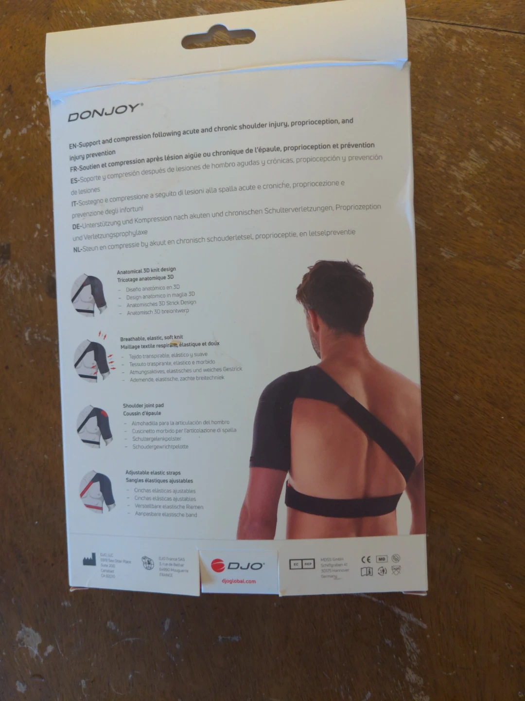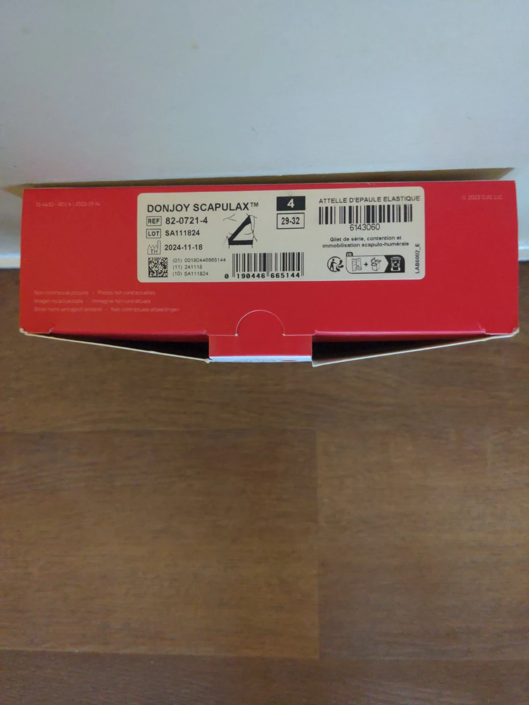 DonJoy ScapulaLax shoulder brace for post-injury and chronic shoulder support. Features an anatomical 3D knit design and breathable, elastic, soft knit material. Includes adjustable elastic straps for a secure fit.