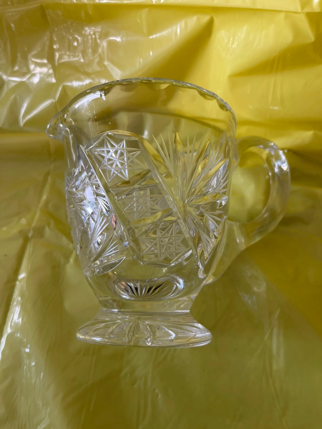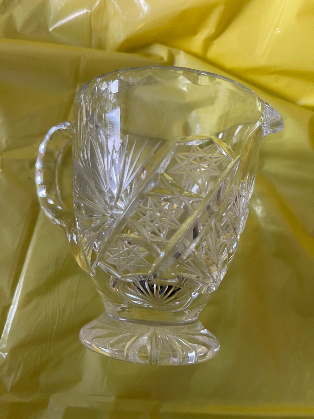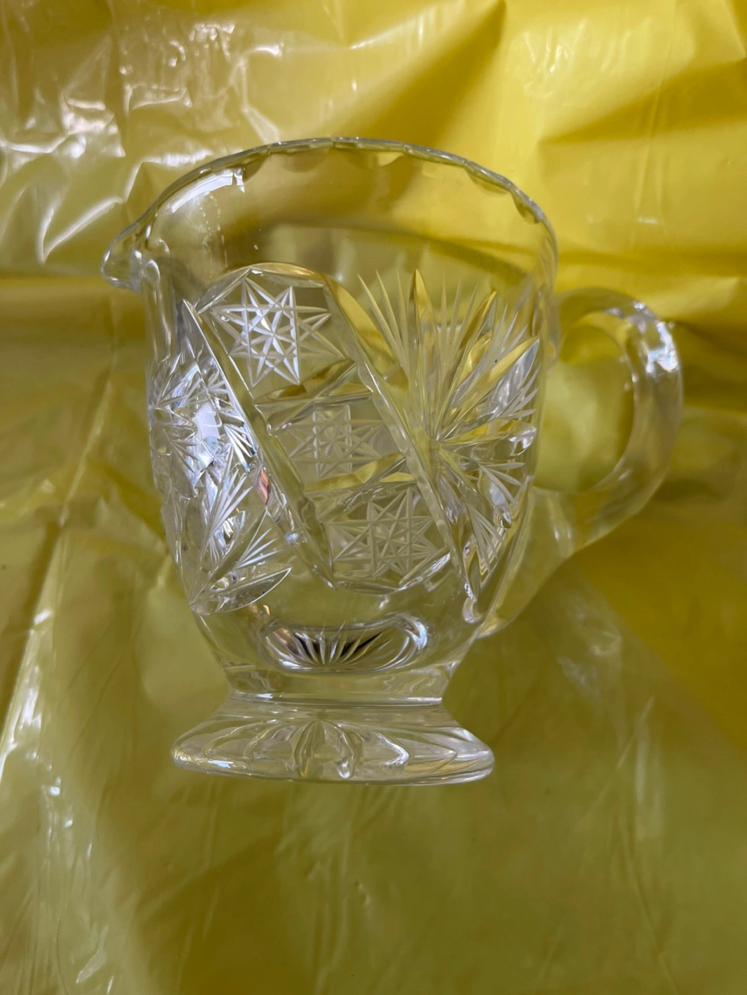 Small vintage creamer. Clear crystal glass. Intricate cut detailing. Perfect for a vintage kitchen or tea set.