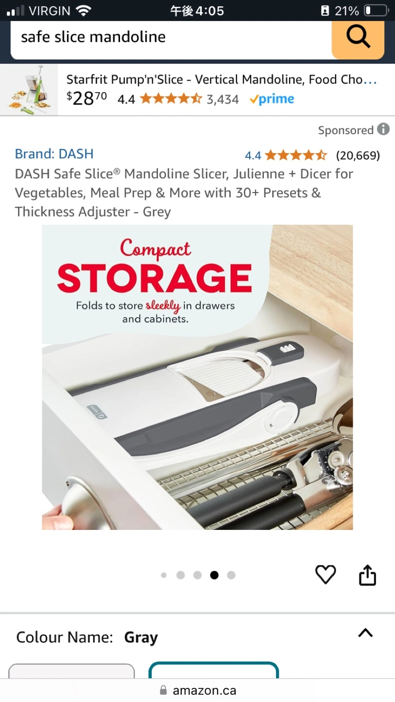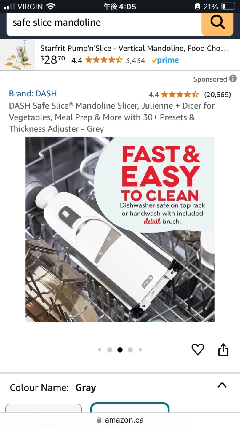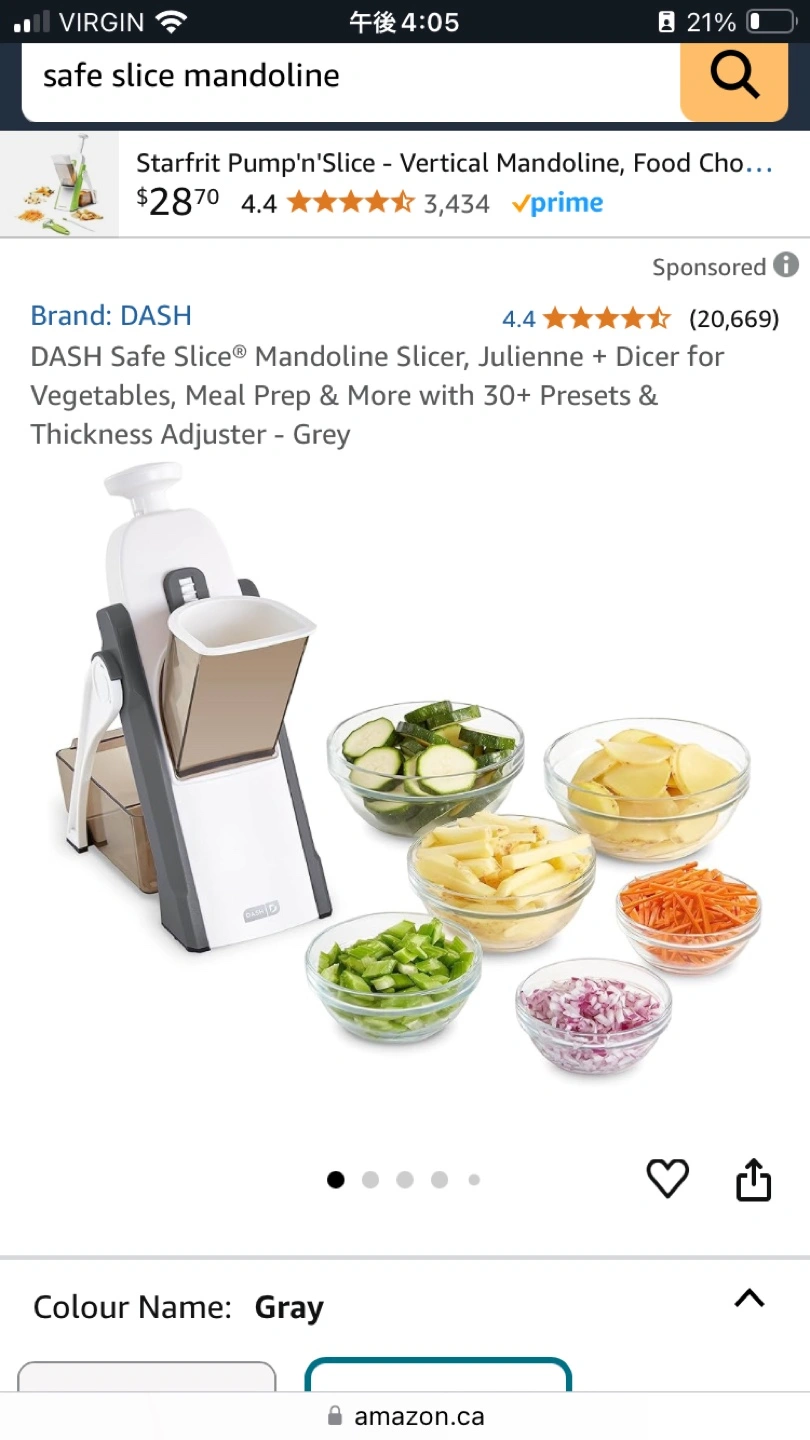 Product page: https://www.amazon.ca/DASH-DSM100GBGY04-Slice-Mandoline-Adjustable/dp/B07XZYXYK9/ref=mp_s_a_1_5?crid=1RCF87K3WPA04&dib=eyJ2IjoiMSJ9.1x9eQICzcekg_aJ9h6iBwAu4BdWmfMoFRnBfYxdBOArqXECA6Bs7sMlB3zxk_SJ8CALO6FCYvaYq6uS2MjTzdvjhBn5G8cM8EbUtMdCMS81z2loO7-xf_ywiXrgh05EY4GNkBlV46T9konU8H8TJ533eA7tXlmFMOltA8S0Eqh84GR9tnwl0gfwiCTj6rbi1AnAr2upGe17aACe5Q-Muow.ZV4PT3nekJ4MmejbYeml5UhSYZdE73o5oRJq4SvmYQc&dib_tag=se&keywords=safe+slice+mandoline&qid=1738616679&sprefix=safe+slice%2Caps%2C112&sr=8-5