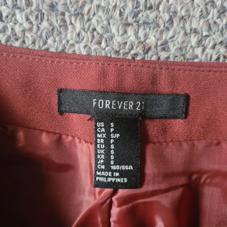 Beige skirt has an elastic waistband and zipper fly +Buttons.