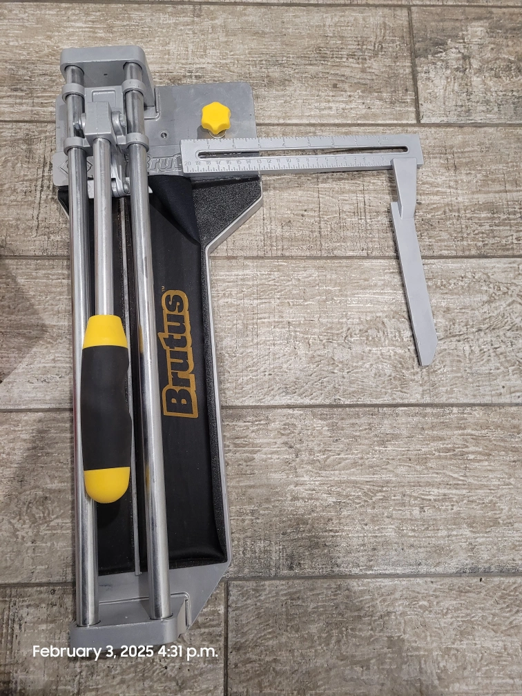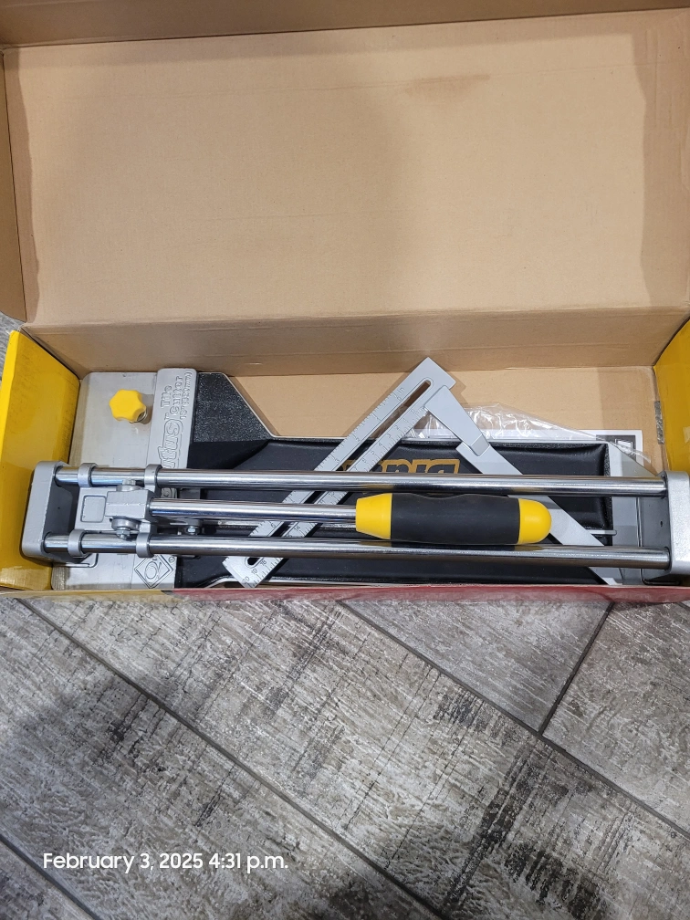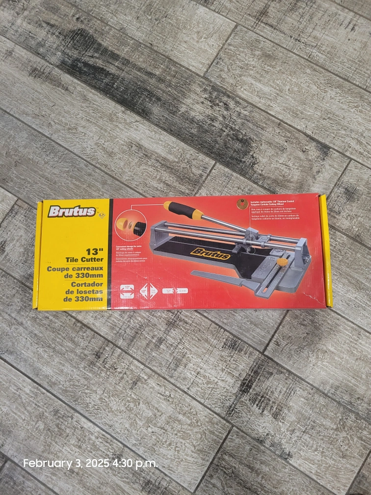 New in box. Manual tile cutter. 13 inch cutting capacity. Includes measuring guides and extra cutting wheels. Perfect for DIY projects.