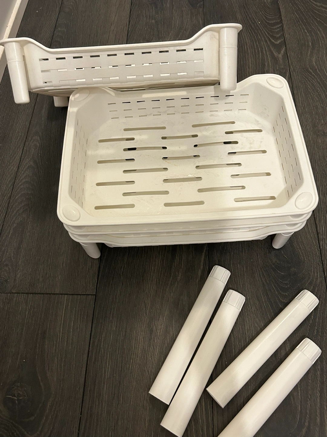 Two stackable white plastic storage baskets. Includes four replacement legs. Great for organizing shelves or pantries.