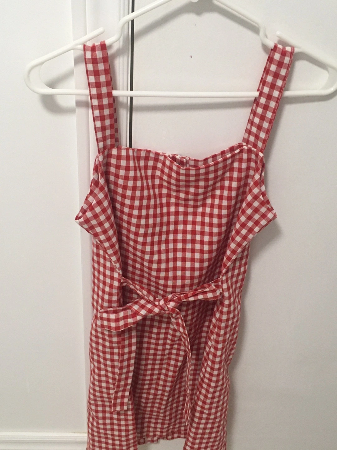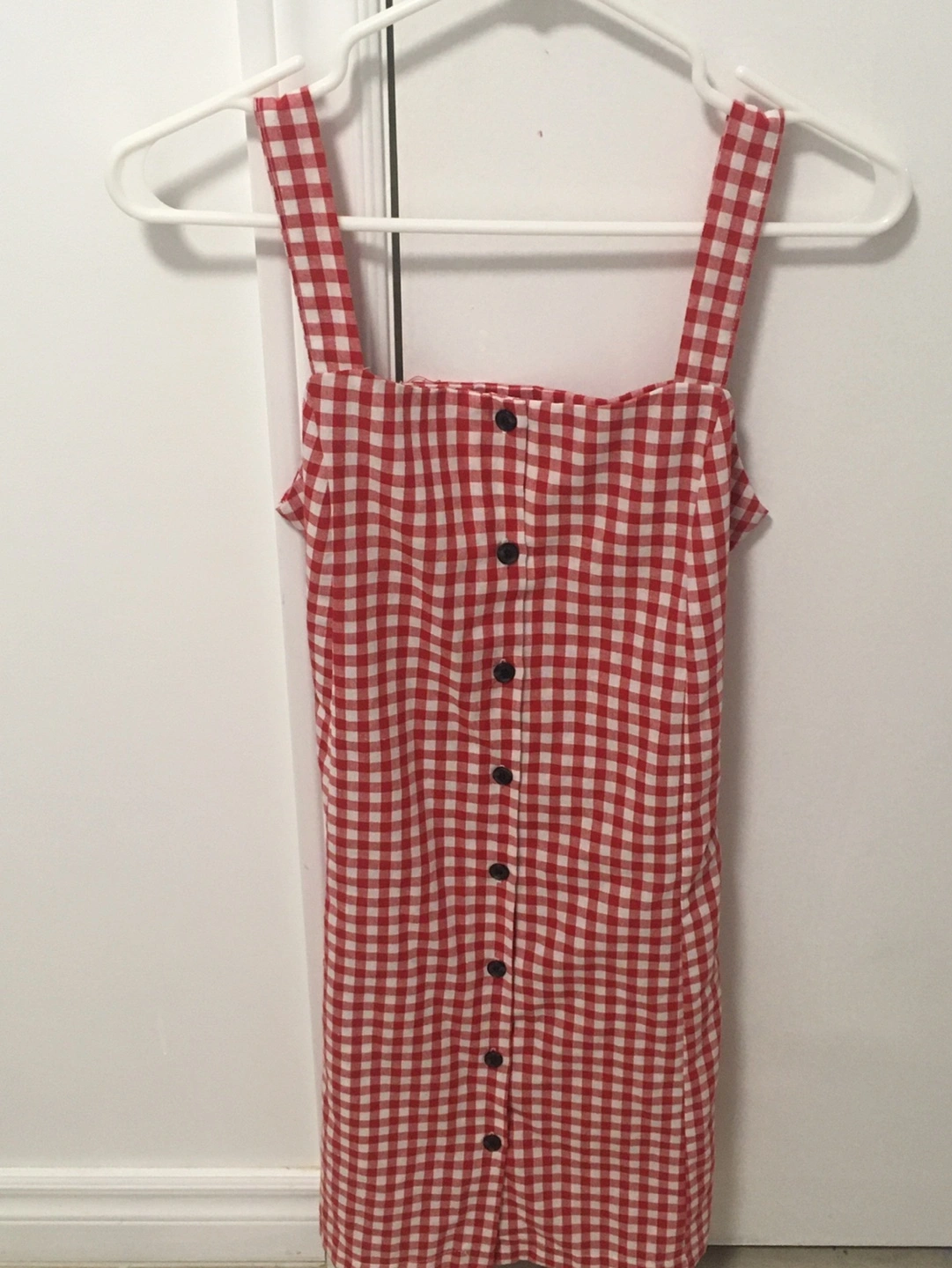 Adorable red and white gingham sundress. Features a button-down front and tie at the back. Made in Korea.