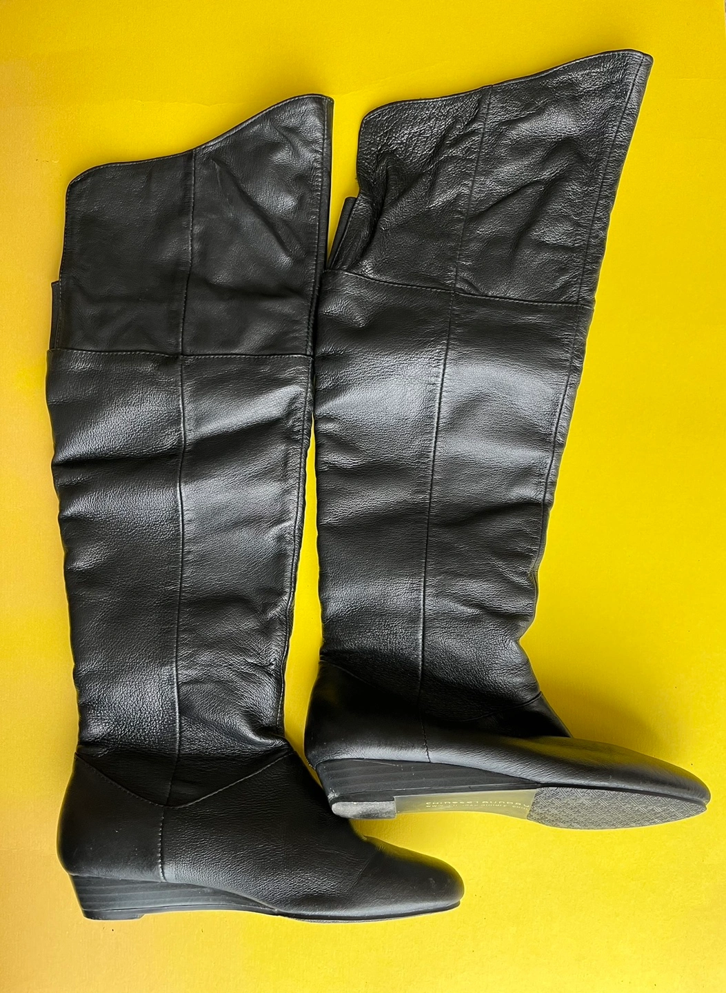 Pair of black leather over-the-knee boots. Low wedge heel. 19” stem. Slouchy style. Great condition. Excellent for fall and winter. Made in China. Size 6M.