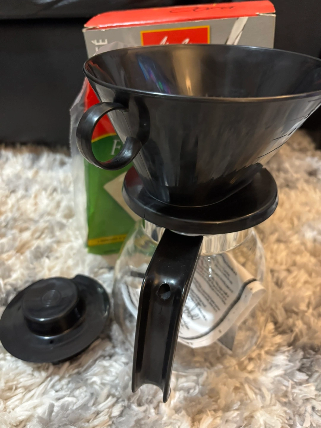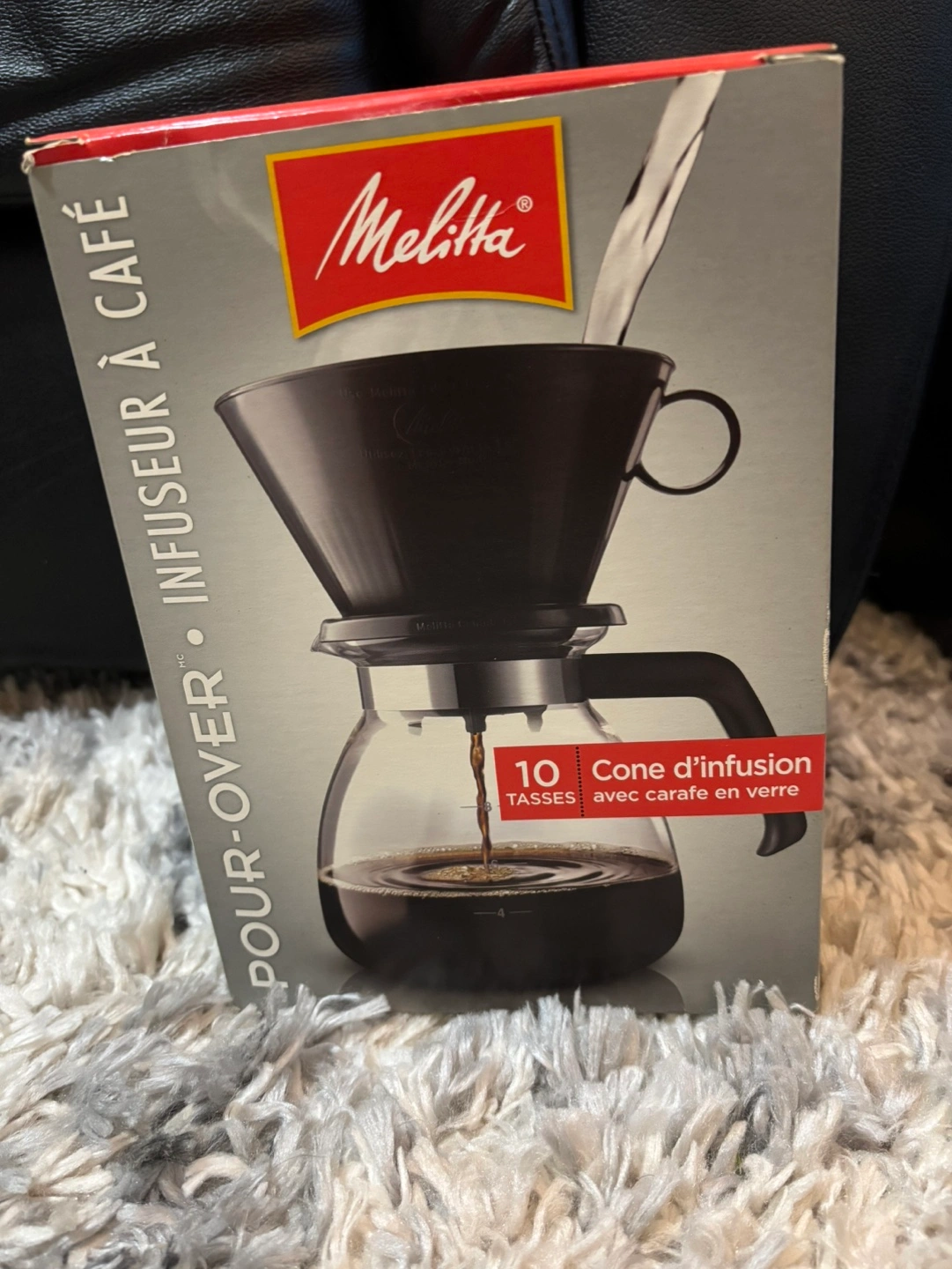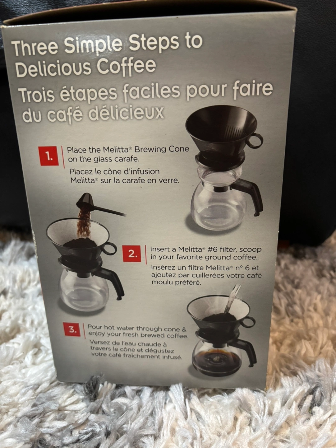 New Melitta pour-over coffee maker. Includes glass carafe, black plastic filter cone, and lid. Makes 10 cups. Number 6 filters recommended. New