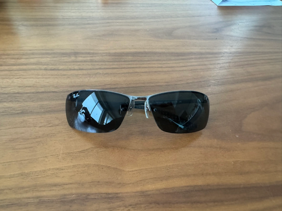 Men's rimless sunglasses. Sleek design. Includes hard case and cleaning cloth. Model number RB 8315.