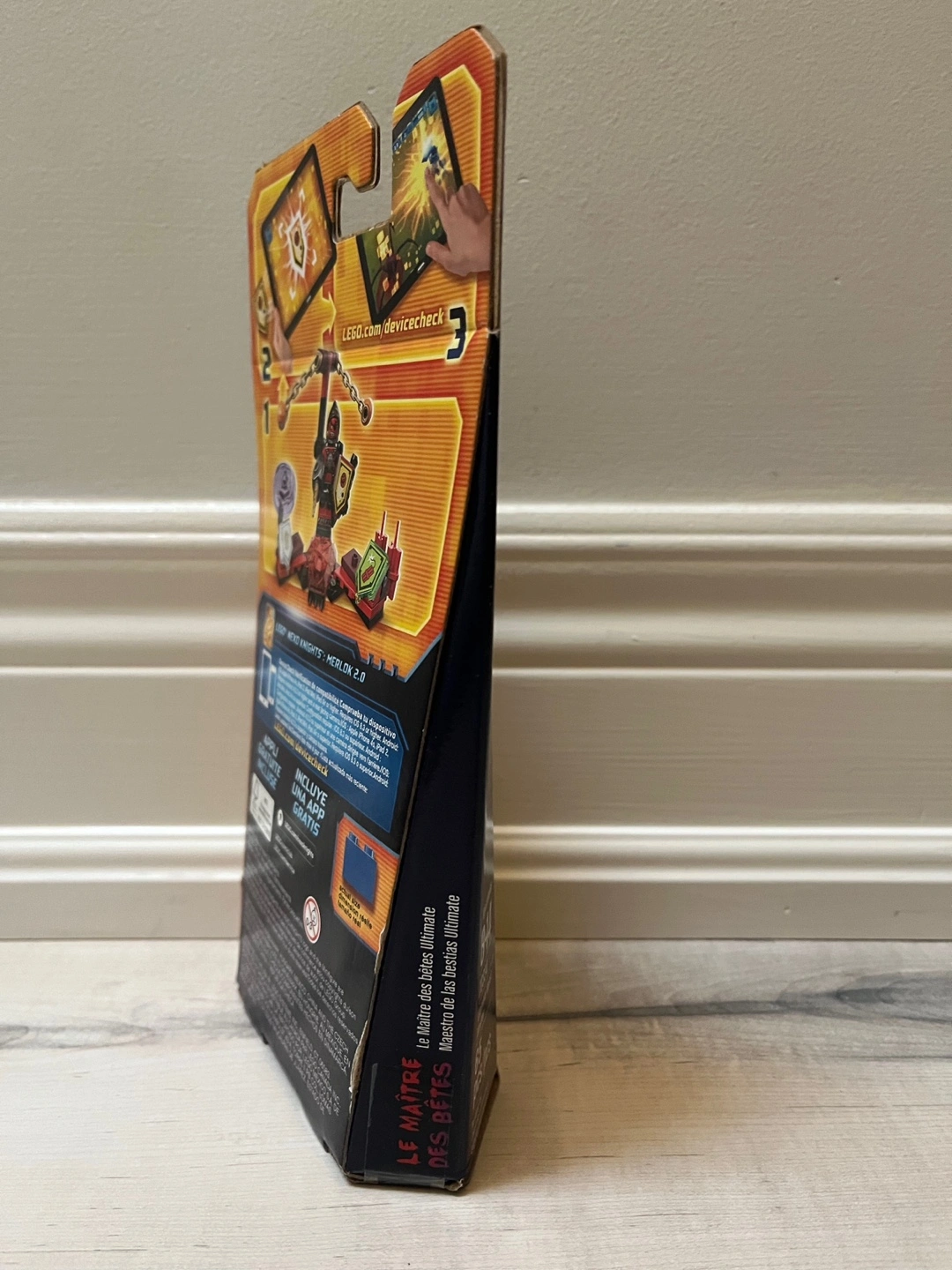 Ultimate Beast Master merges live-action play with 3 scannable shields to obtain unique NEXO Powers for digital gaming. Weapons include 2 Globlin chains and a drill dagger. Accessory elements include a Force Field shield disc, 2 pieces of dynamite, hood and a showcase stand. Throw sticks of dynamite to attack the enemy with the element of surprise! Swing the Globlins around Ultimate Beast Master using the rear mechanism. Includes an Ultimate Beast Master minifigure. Set was retired in April 2017. Sealed box.