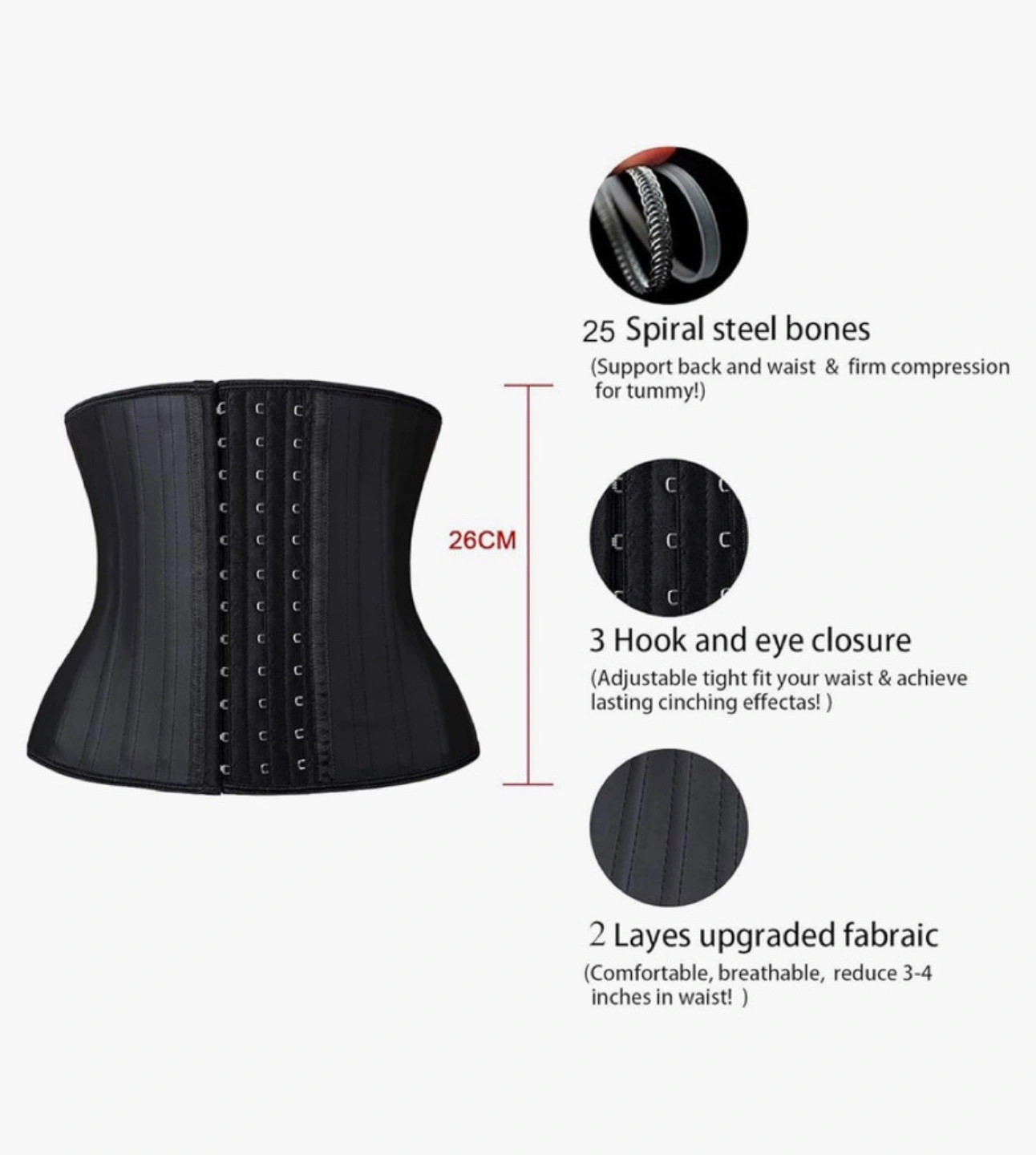 -High elasticity spiral steel bones supports, flexible and durable, bend easily but recover quickly to the origin, Three rows of hooks allow for the size adjustment for the shrinking midsection.