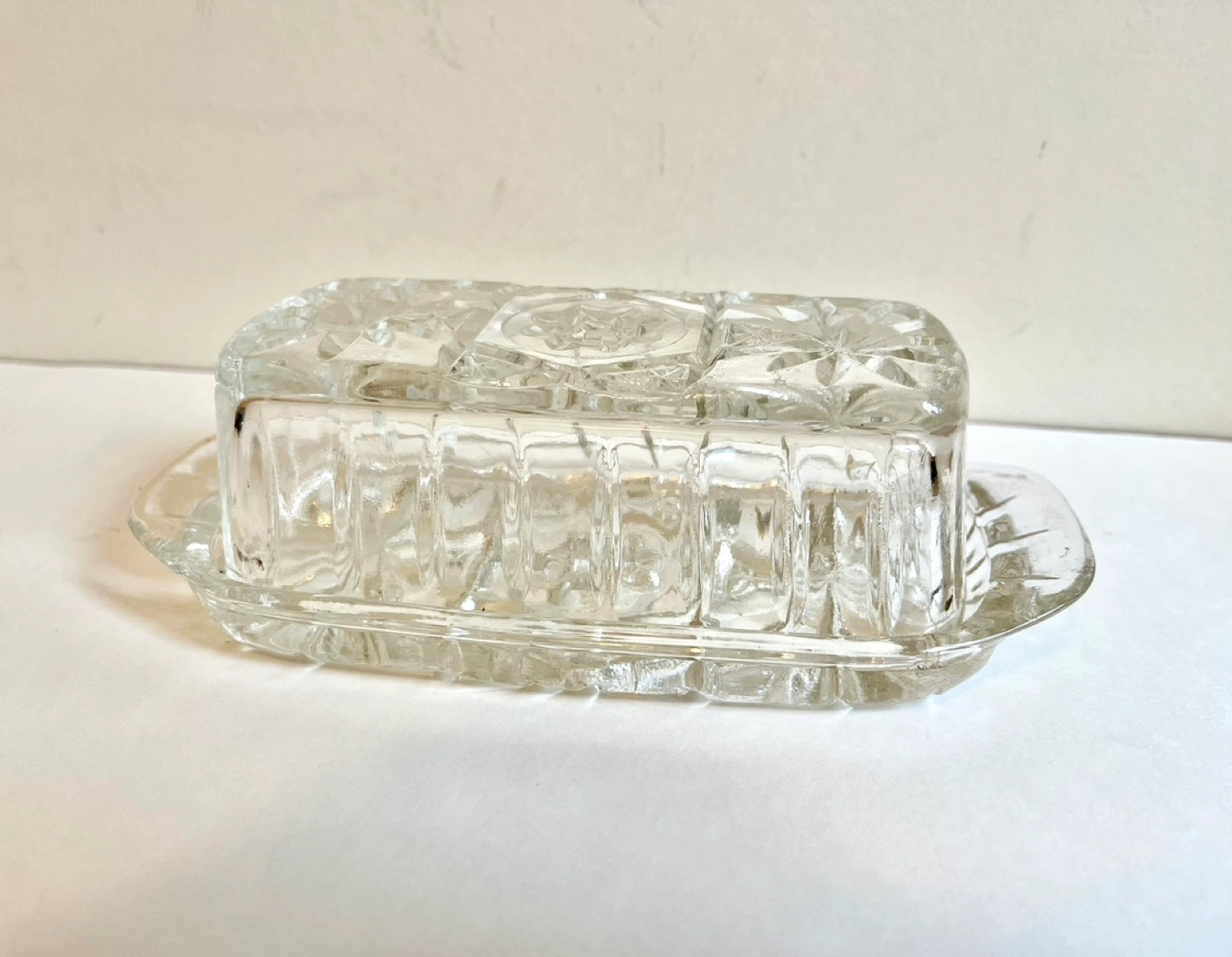 Clear glass butter dish. Etched star pattern. Rectangular shape. Includes lid and base. Lovely addition to your kitchen.