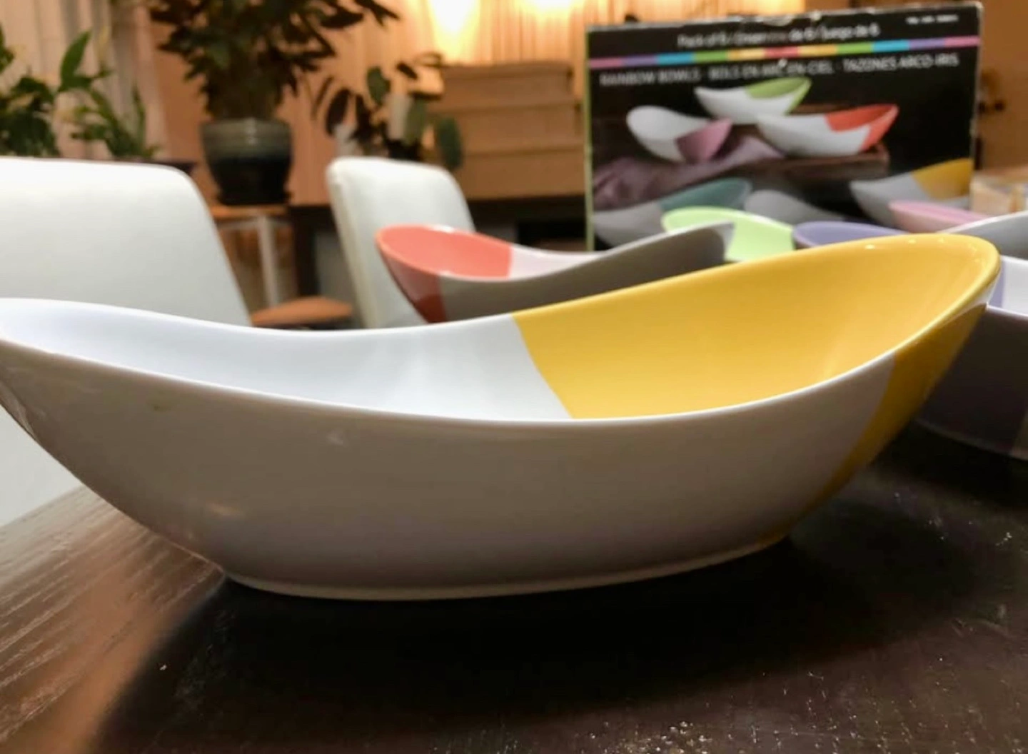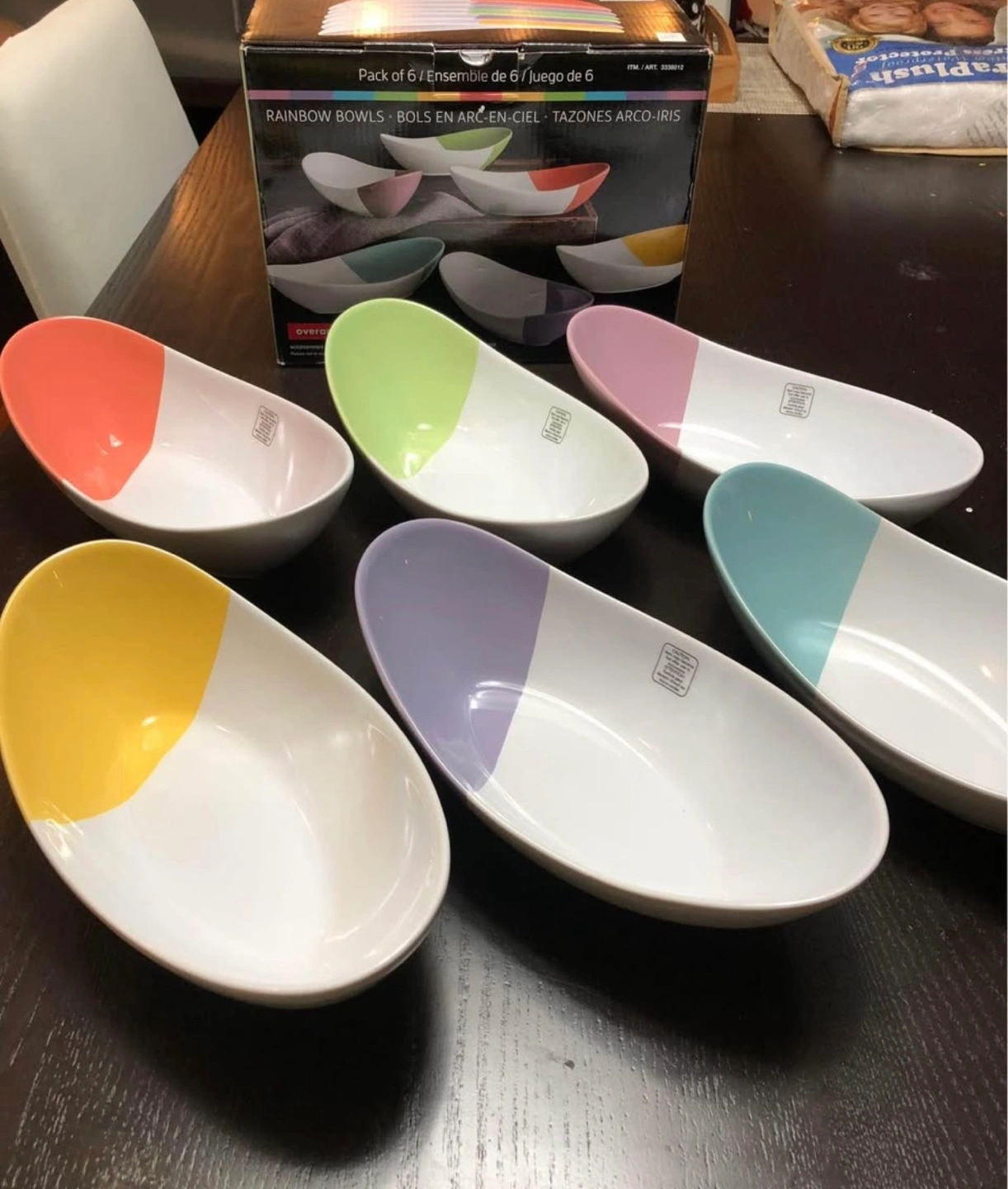 374Six colourful, oval-shaped bowls. Part of a set. Modern design. Brand new with box.