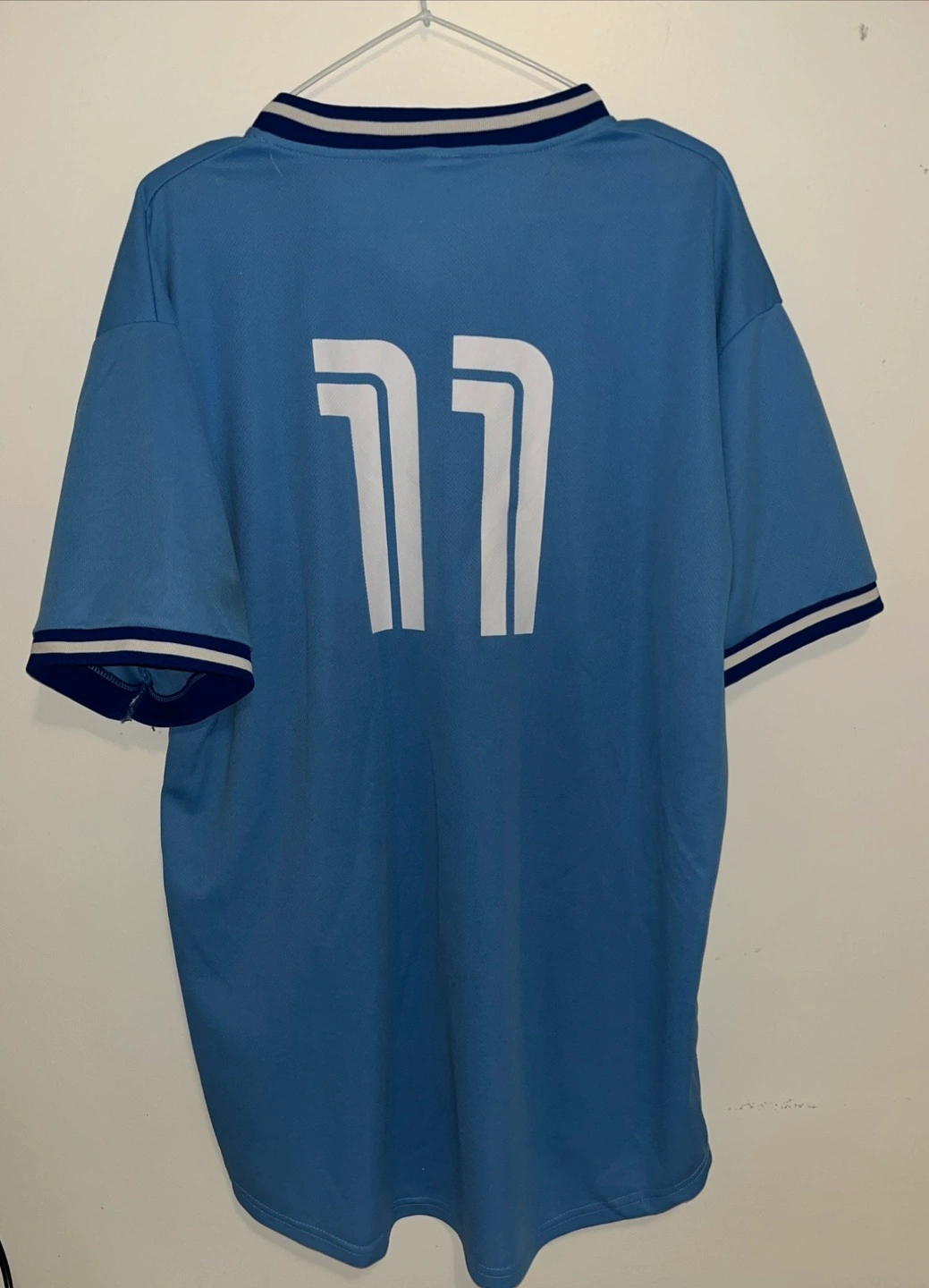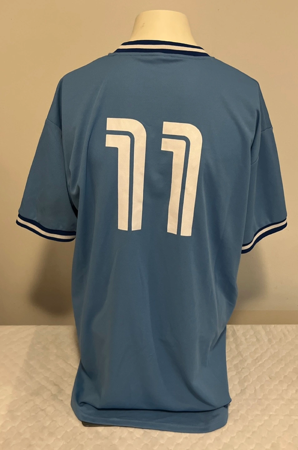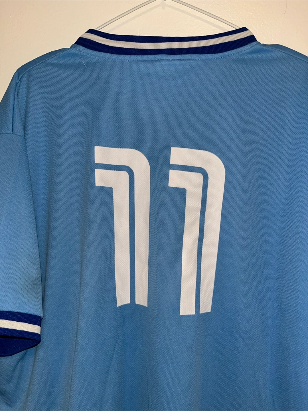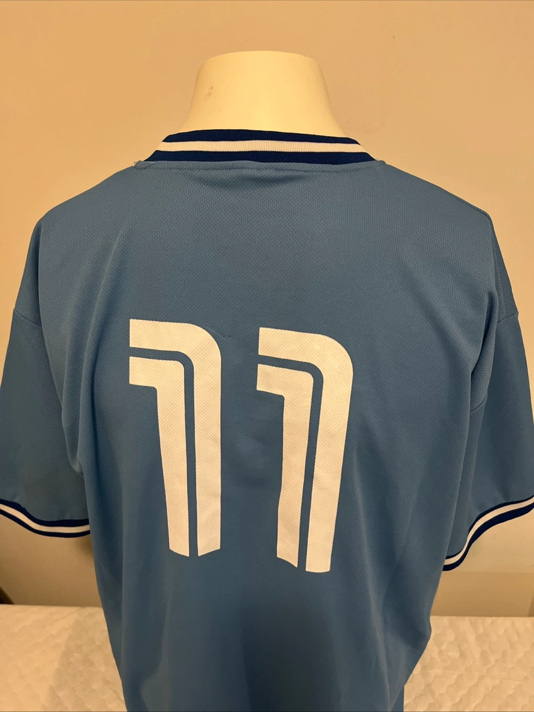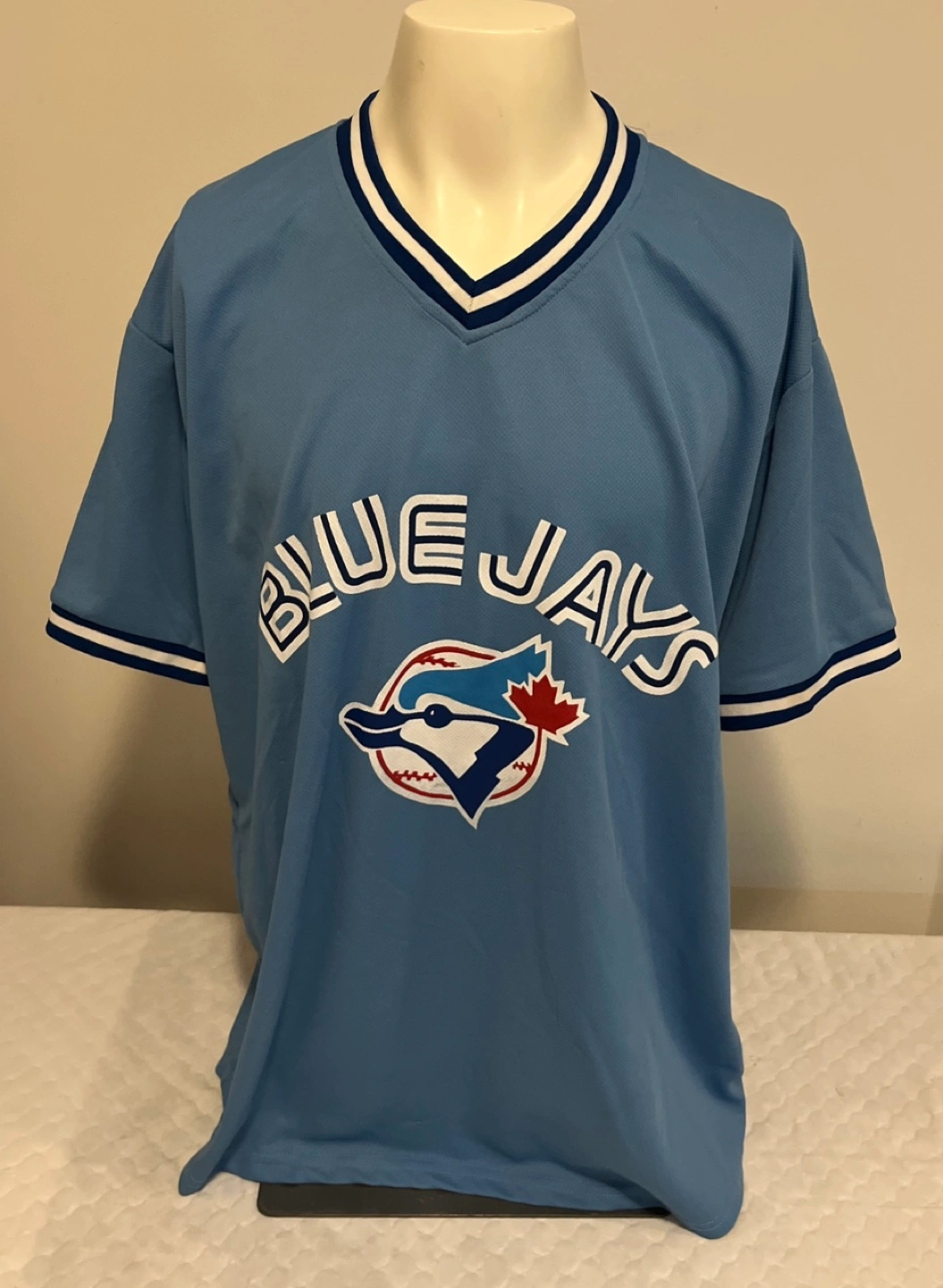 Show your Toronto Blue Jays pride with this XL George Bell #11 powder blue baseball jersey. Perfect for any baseball fan, this jersey is a must-have for game days or casual wear. Made for unisex adults, this jersey is a great addition to any fan's collection. Get your hands on this limited jersey as a special giveaway item.