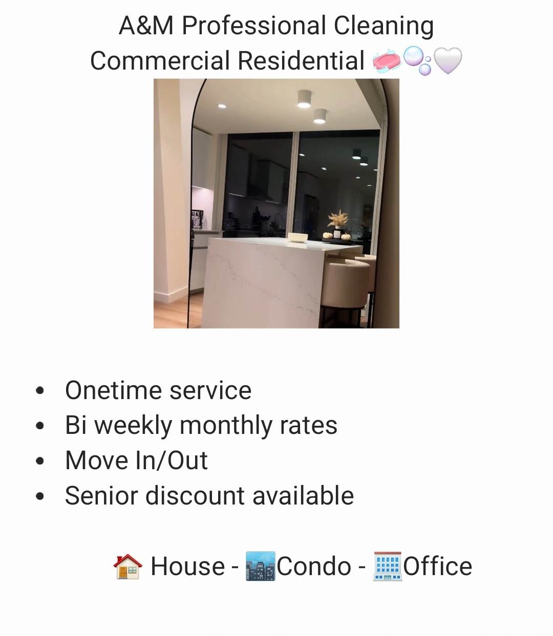 Commercial and residential cleaning services. One-time service, bi-weekly and monthly rates available. Move in/out cleaning. Senior discount offered. Houses, condos, and offices. WhatsApp #6044420852 40-50hr