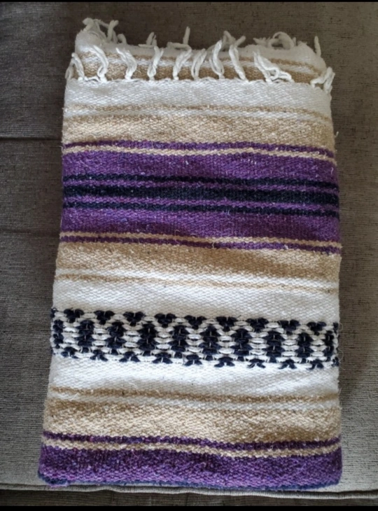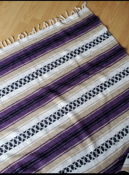 Blanket from Mexico. Striped pattern in purple, beige, white and black. Fringed edges. It has only been used on the back of a couch. Perfect for adding color and texture to your space.