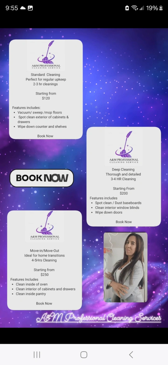 A&M Professional Cleaning Services price list. Includes standard, deep, and move-in/move-out cleaning options. Prices and services listed. 247 after celebration ,parties, functions house, office ,air b n b