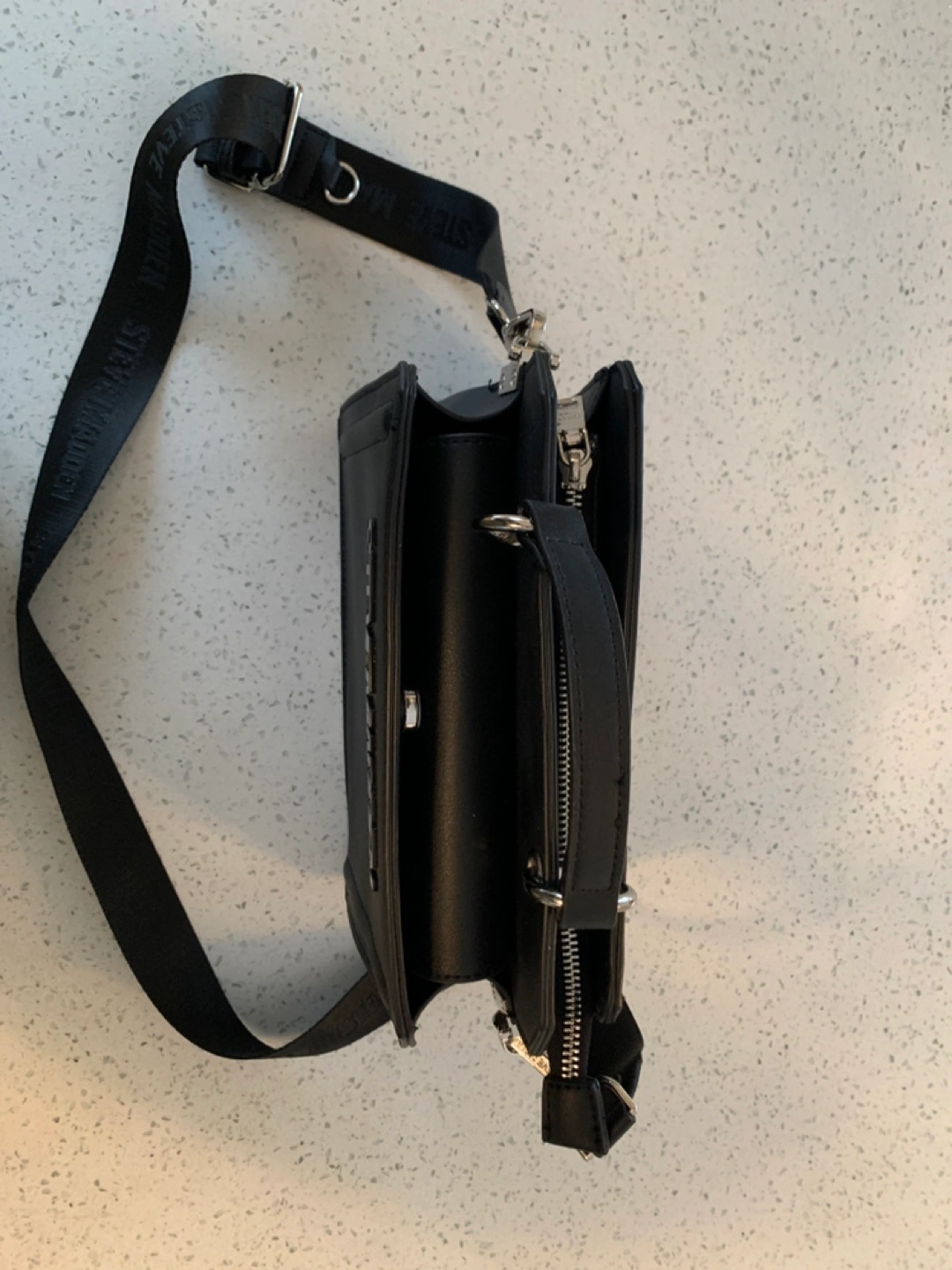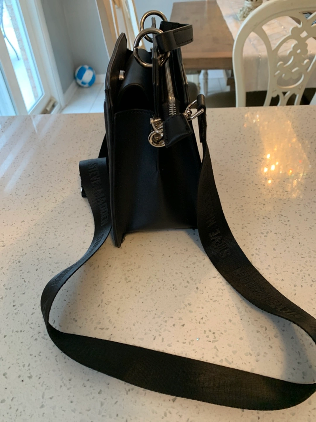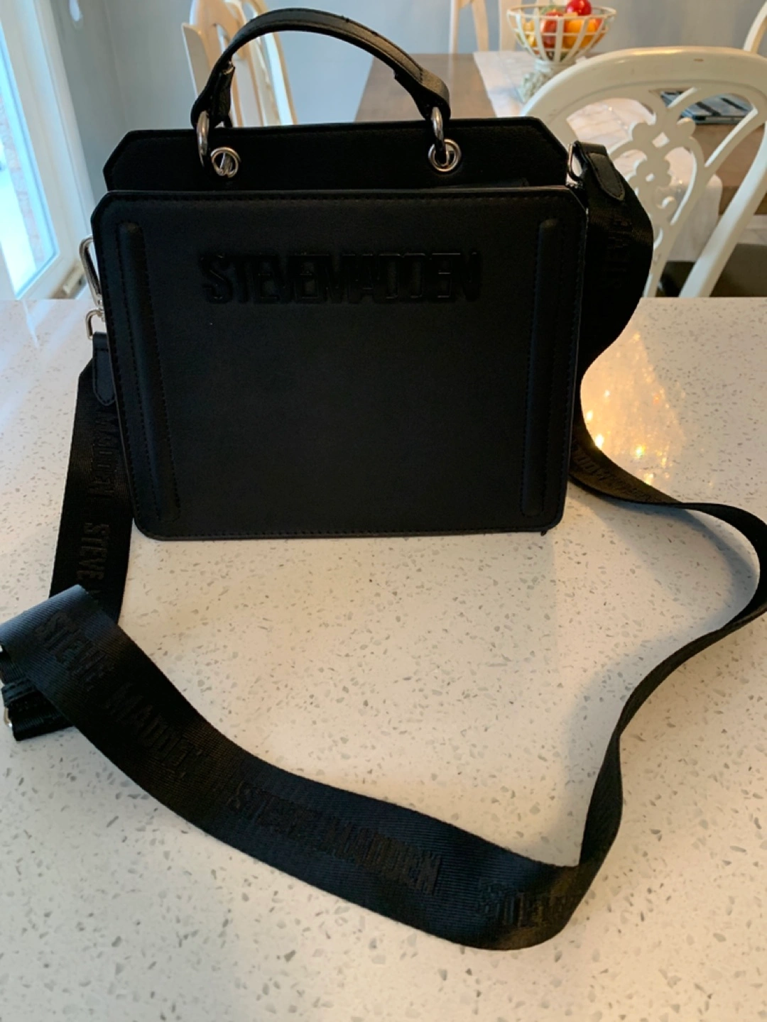 Steve Madden black leather-look satchel. Features a top handle and adjustable crossbody strap. Silver-toned hardware. Zip closure. Small front pocket. Never used brand new