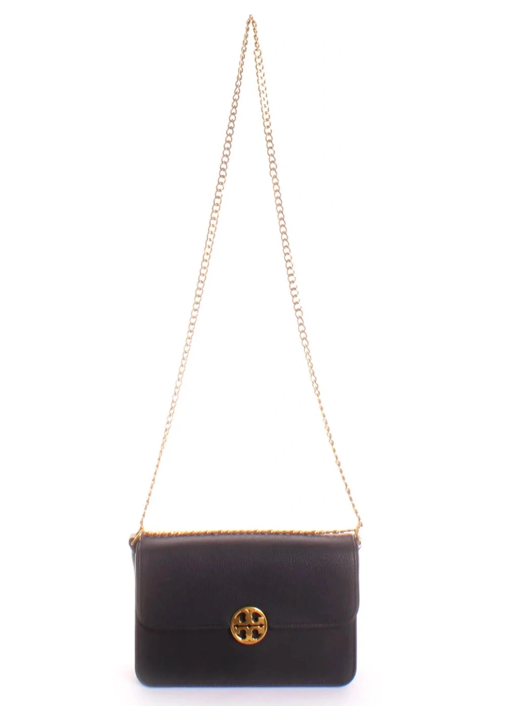 Gorgeous black leather crossbody bag. Features gold-tone hardware and a chain strap. Small but spacious interior. Perfect everyday bag.