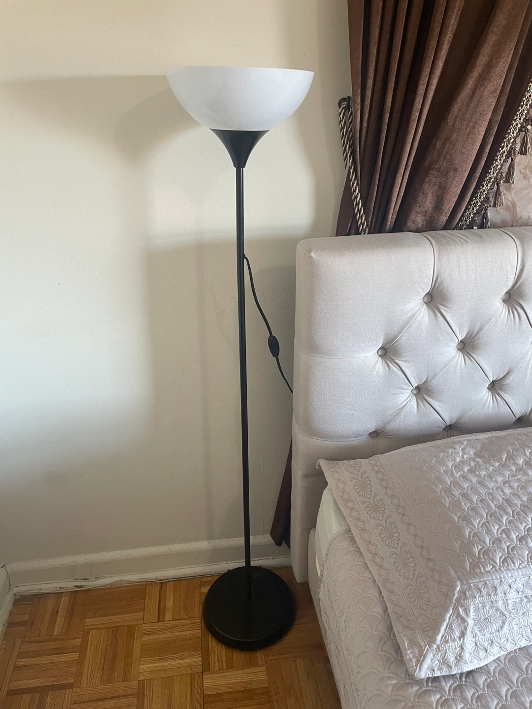 Simple and elegant floor lamp. Black metal base and a frosted white shade. Great for bedrooms or living rooms. In good condition.
