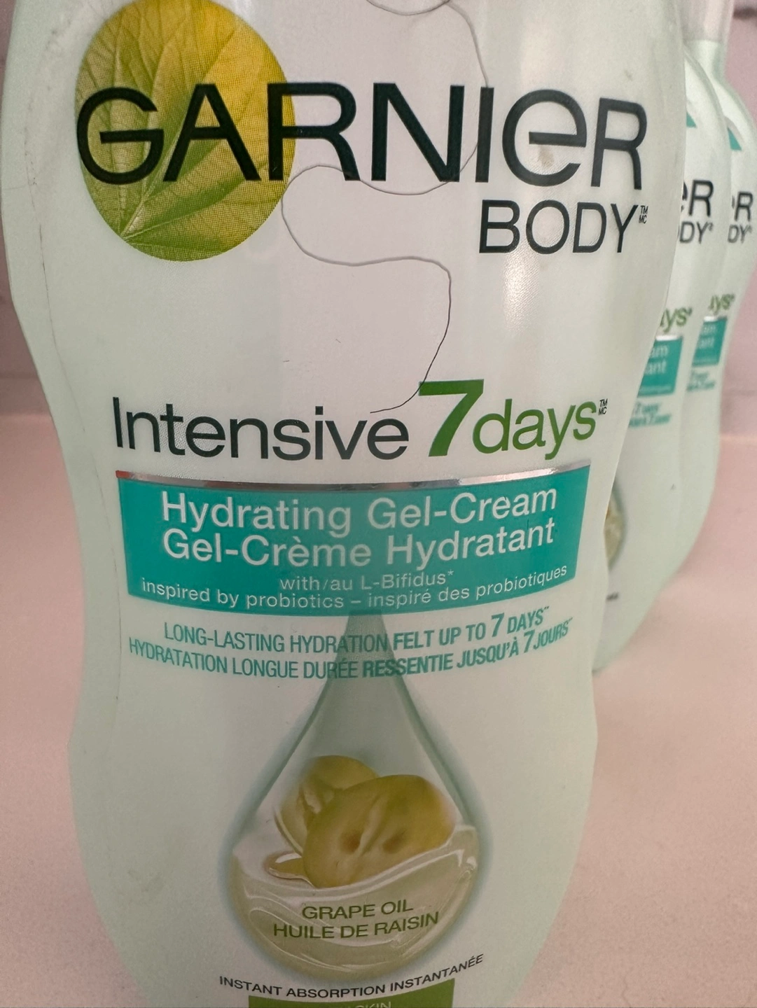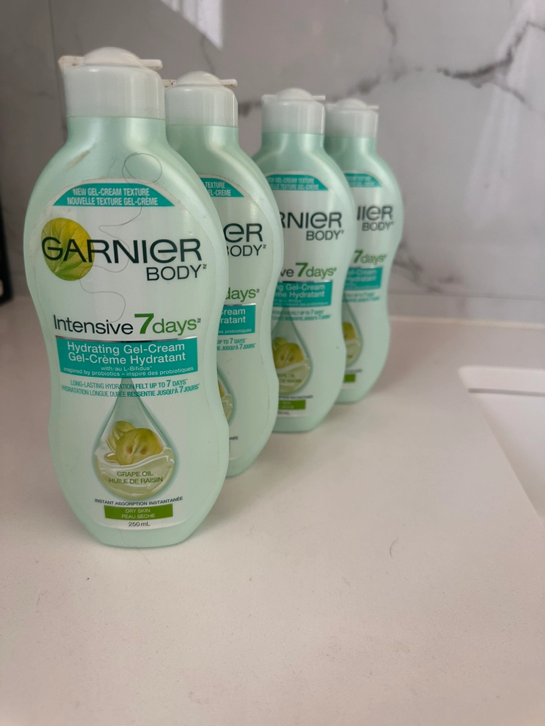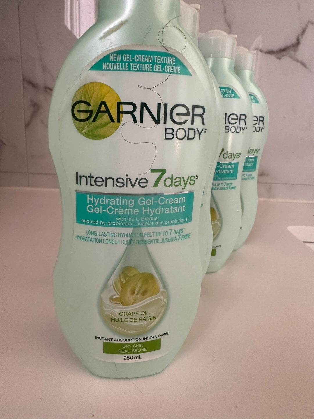 Four bottles (2 full and 2 used) of Garnier Body Intensive 7 Days Hydrating Gel-Cream. New gel-cream texture. Grape oil. Dry skin. Long-lasting hydration. Inspired by probiotics. Pick up only (cash)