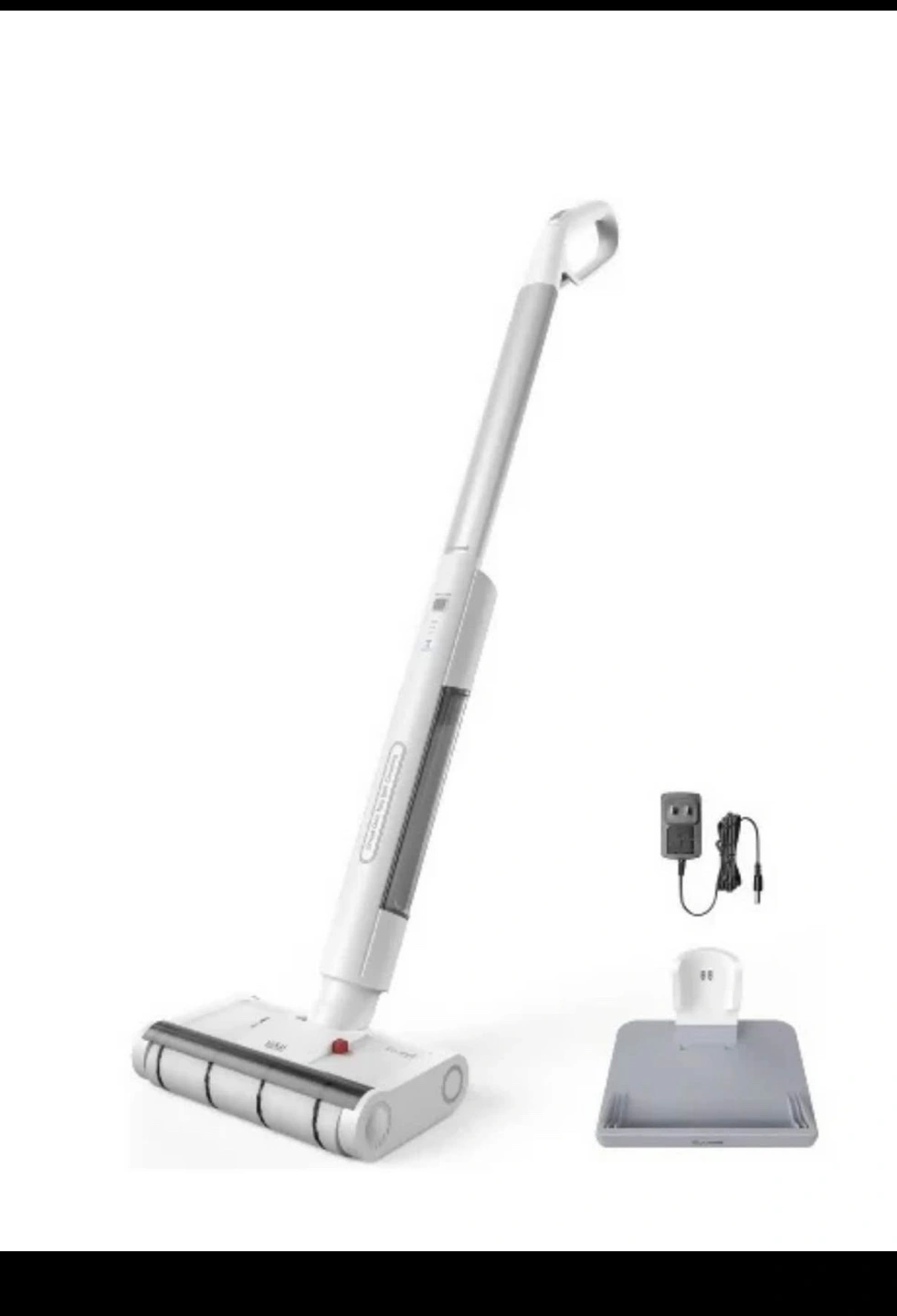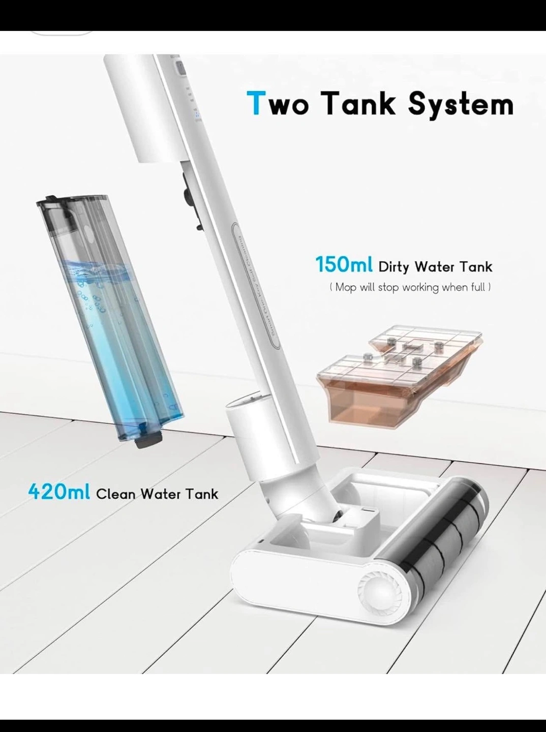 Cordless and self-cleaning spray mop. Features a two-tank system with a 420ml clean water tank and a 150ml dirty water tank. One-click self-cleaning function. Suitable for various floor types including tile, hardwood, laminate, vinyl, and marble. Includes charger and charging dock.