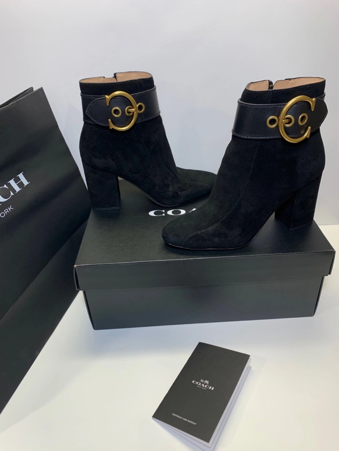 Crafted of velvety suede, our go-everywhere Dara Bootie features a comfortable block heel perfect for all-day wear. The streamlined silhouette is accented with our Coach buckle for a touch of shine.