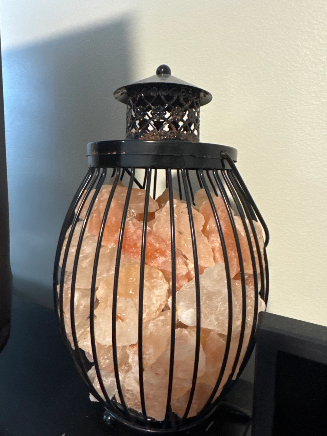 79Ornamental salt lamp. Pink Himalayan salt rocks in a black metal cage with a decorative top. Perfect for adding ambiance to any room.