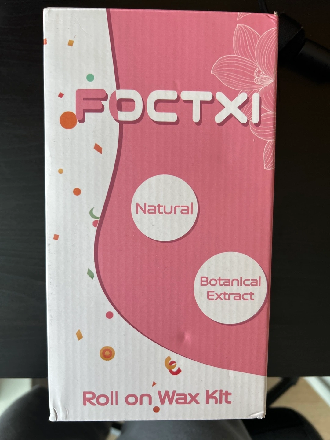 New, unopened FOCTXI roll-on wax kit. Includes wax heater, wax cartridges, wax strips, user manual, and after wax kit. Botanical extract. For hair removal. Made in China.