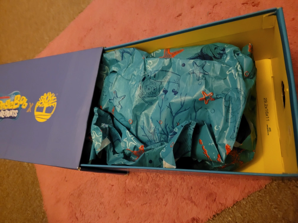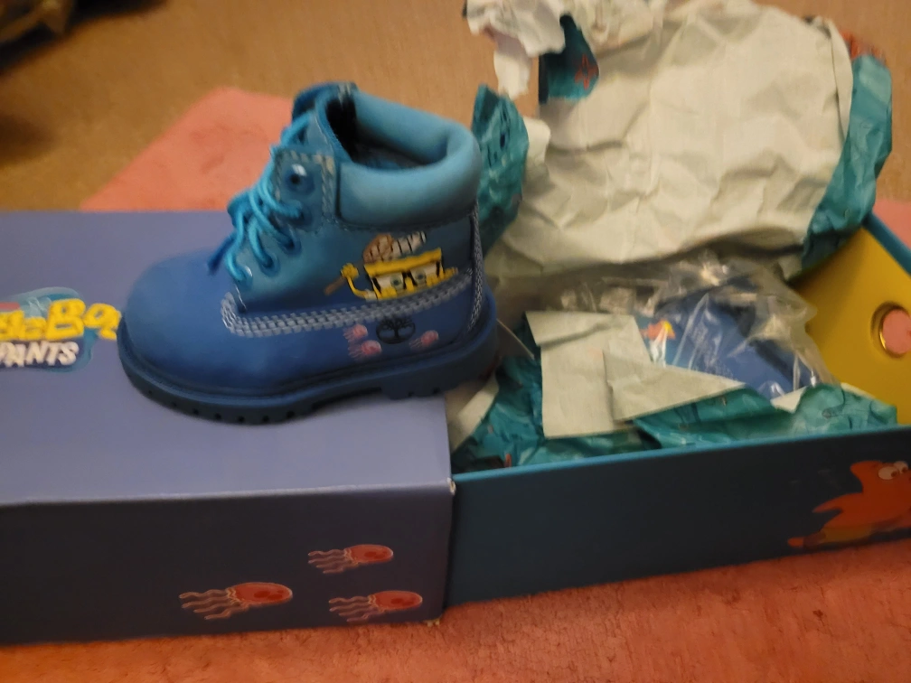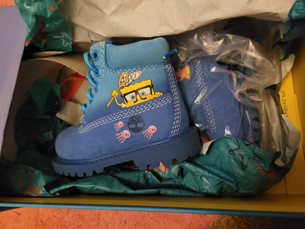 61Brand new, never worn. Adorable blue nubuck boots. SpongeBob SquarePants design. Comes in original box. Waterproof.
